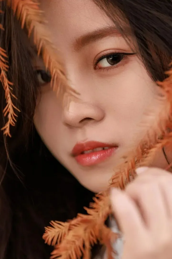 把红杉枝叶用双手轻轻拢在额头旁边,不用裹太紧,露出眼睛和部分脸颊,头发稍微散一点,镜头靠近拍,温柔又慵懒的感觉一下子就出来了。