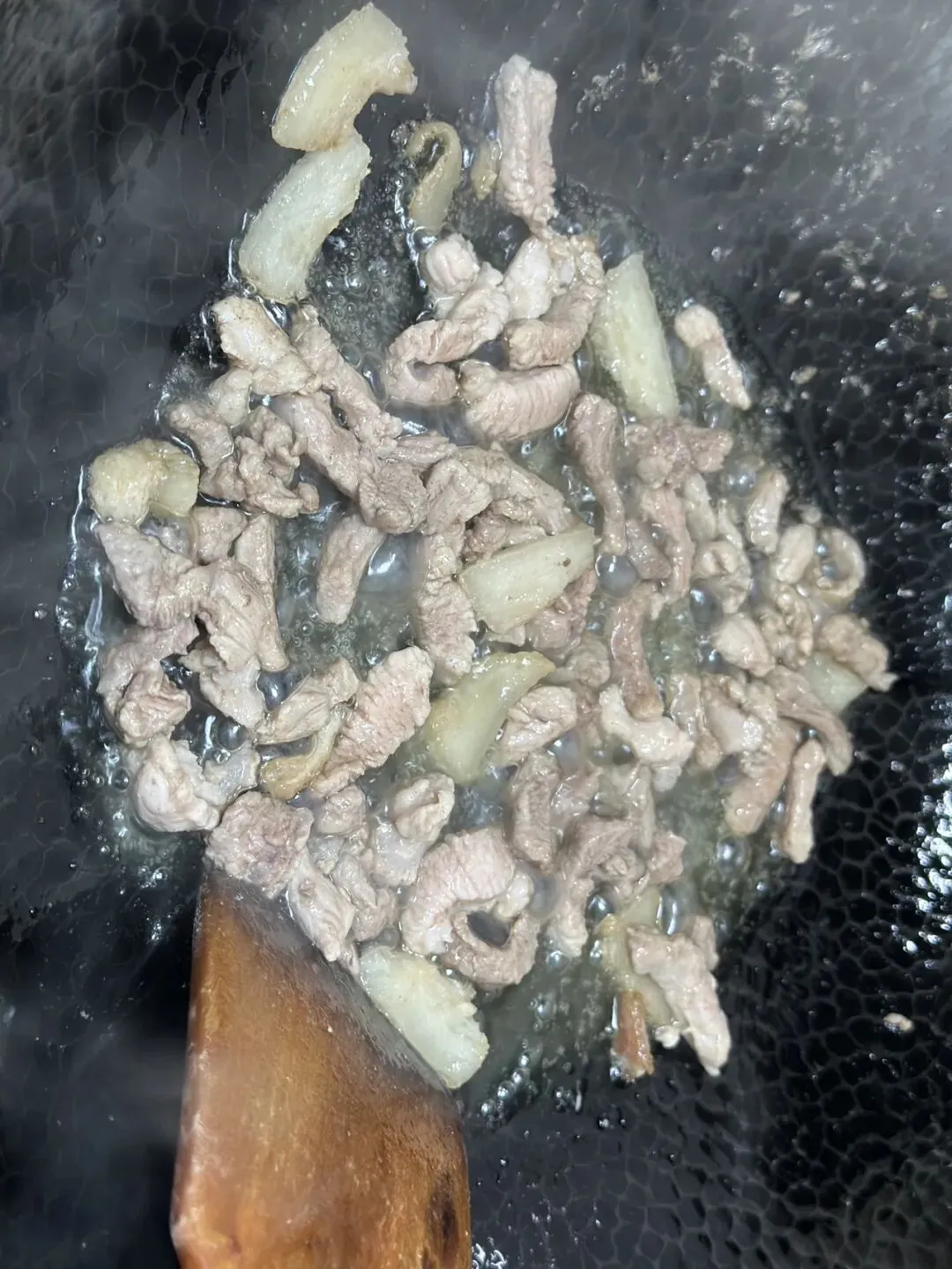 2. 炒香肉丝:热锅倒油,油热后放入姜丝、一半蒜片爆香,倒入腌好的肉丝,大火快速滑炒至表面变色,别炒太久,避免肉丝变老。