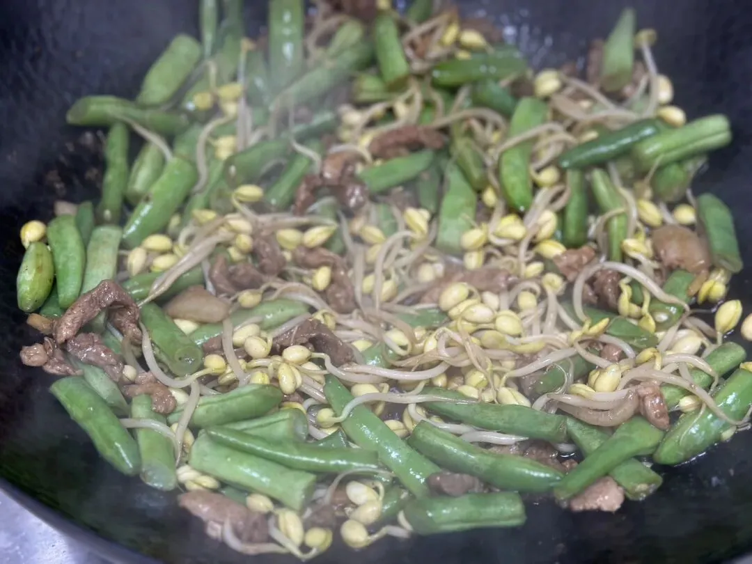3. 焖煮豆角:锅里放入豆芽、豆角翻炒3分钟,至表面微焦、颜色变深绿,加干辣椒(可选)、剩余蒜片,翻炒出香味。