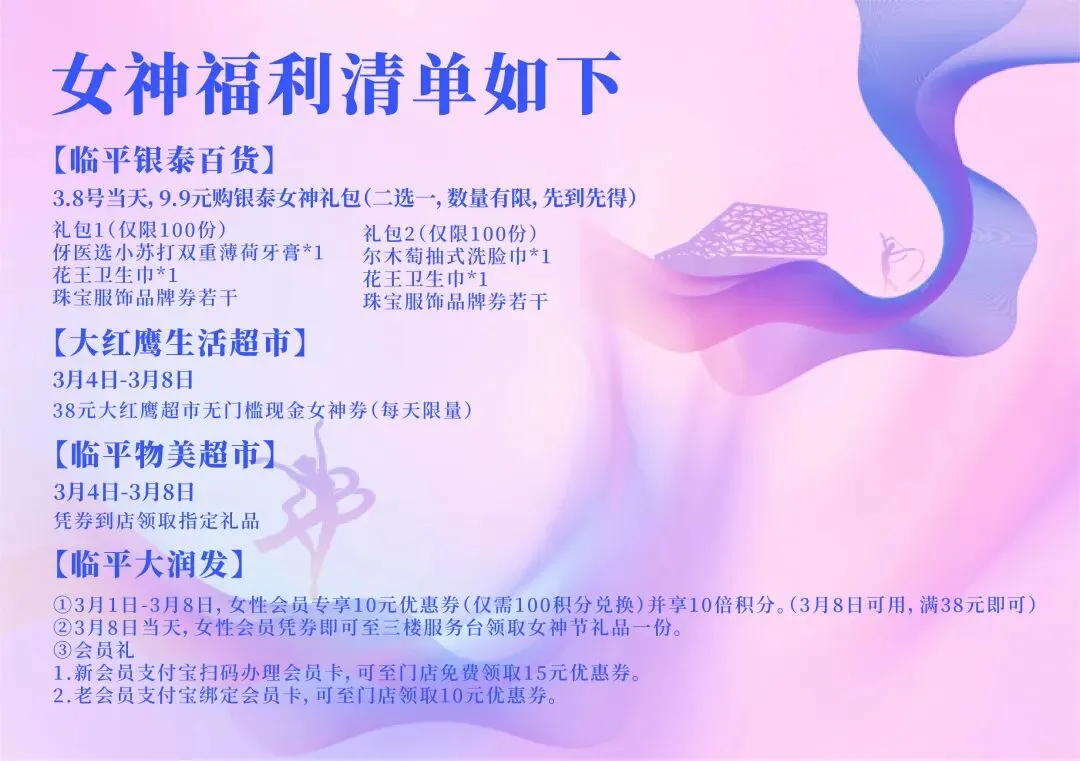 女神商超通用券面向女性群体公开发放,活动期内女性市民可以凭借女神商超通用券至临平银泰、大红鹰生活超市、物美超市、临平大润发兑奖,享受指定女神优惠。每人仅限兑换一次,部分福利数量有限,先到先得。(最终解释权归活动主办方所有)