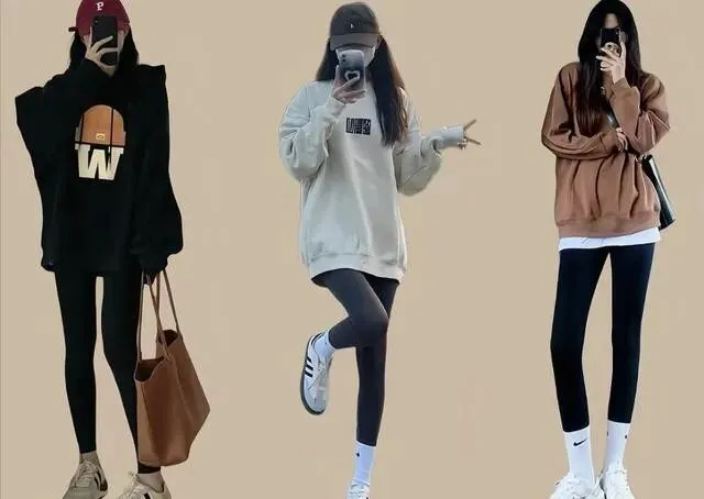 下装搭紧身裤、运动裤、百褶裙都行 , 记住一个原则 , 上松下紧 , 平衡感就有了。