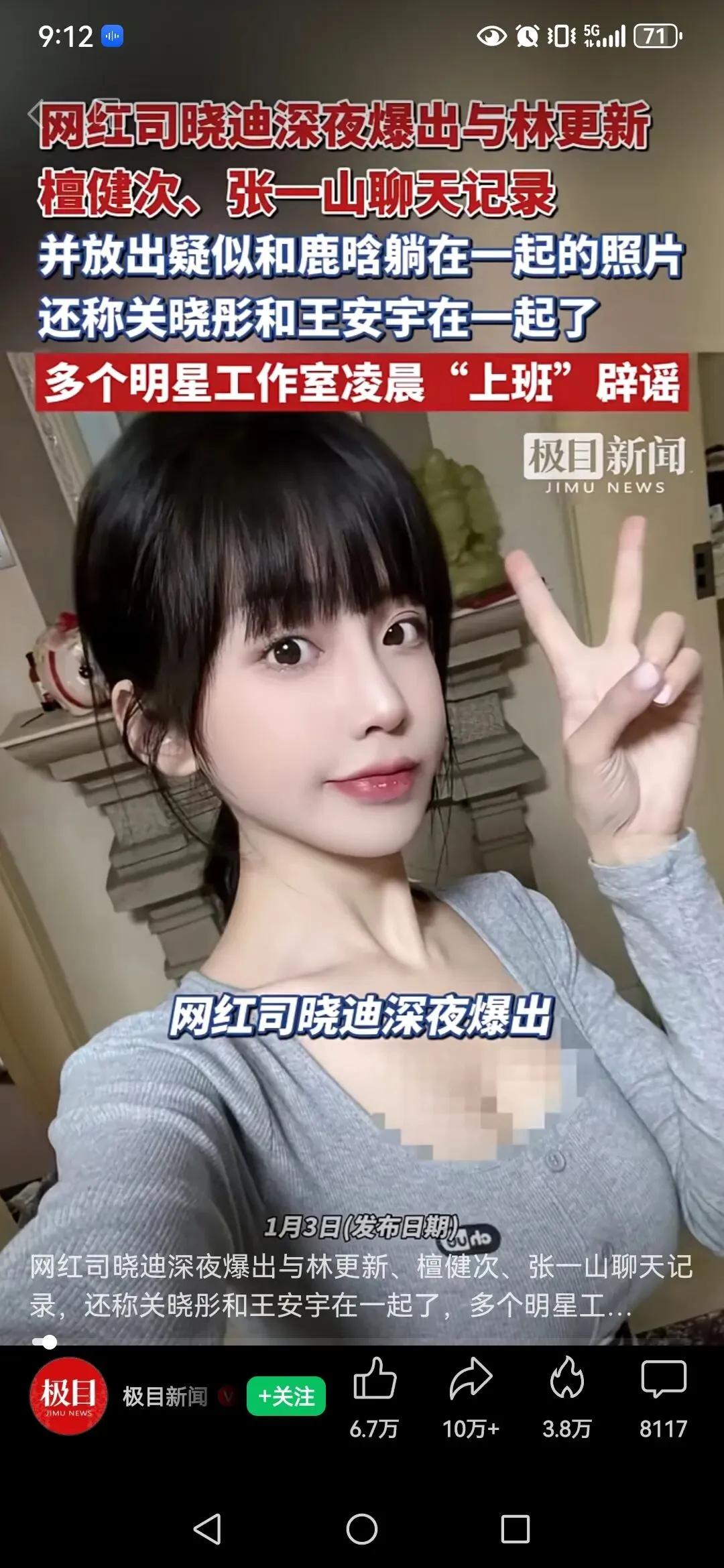 2026年1月,司晓迪祭出了她的“终极武器”。从1月2日深夜开始,她在微博、抖音、小红书等平台密集发布动态,自称“30岁前睡遍内娱顶流,人生没有遗憾”,无差别扫射鹿晗、范丞丞、林更新、檀健次、蔡徐坤、张一山、周奇、黄明昊等十余位当红男艺人。她放出大量所谓的“证据”:打码的“同床照”(刻意露出与鹿晗相似的纹身)、隐去实名的转账截图、角度刁钻的聚会合影、断章取义的聊天记录(涉及檀健次的“遗留短袖”、林更新的“长途驱车”等),甚至给艺人贴上了“床上表现”的争议标签,还隐晦提及已入狱的吴某凡。她在评论区暗示握有更露骨证据,吊足网友胃口,相关话题瞬间引爆,阅读量狂飙破十亿,被网友戏称为“开年核弹”、“国服嫂子”。