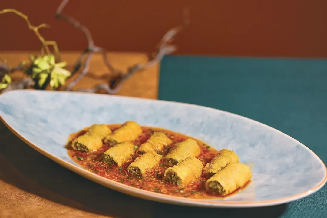 此菜创意来自传统网油腰卷,成菜口感层次丰富。