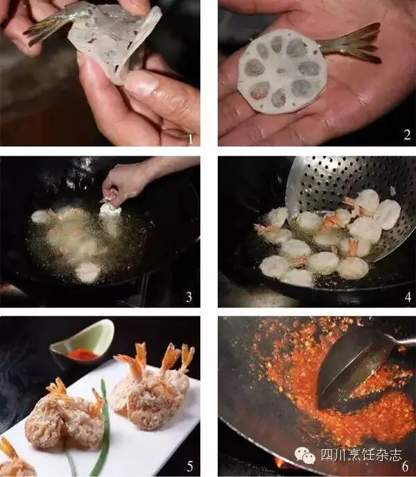先把虾肉捶成泥,入碗调味搅匀后,酿入藕夹,待逐一拍匀干淀粉后,下热油锅里炸酥,捞出来装盘并淋鱼香味汁。这种成菜方式,也是川菜厨师常用的一种手法。在虾泥里添加其他原料,也可换外面用来包裹夹制的原料,还可调成其他味型,从而演绎出更多的虾肴。