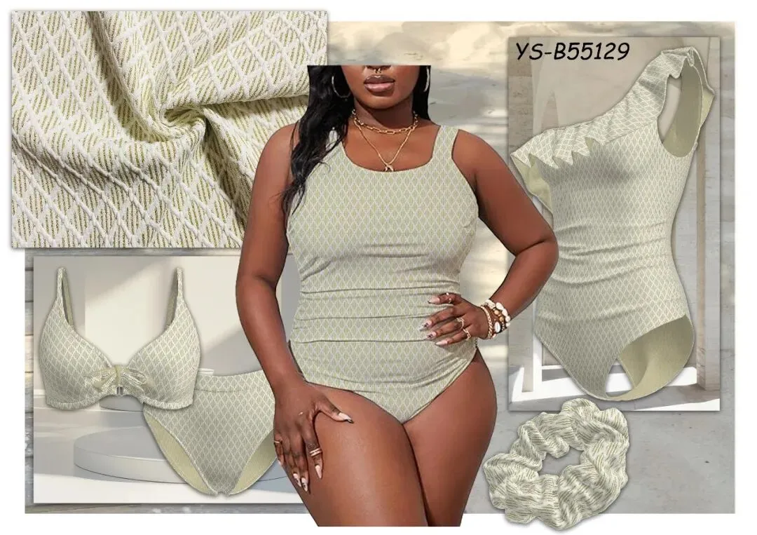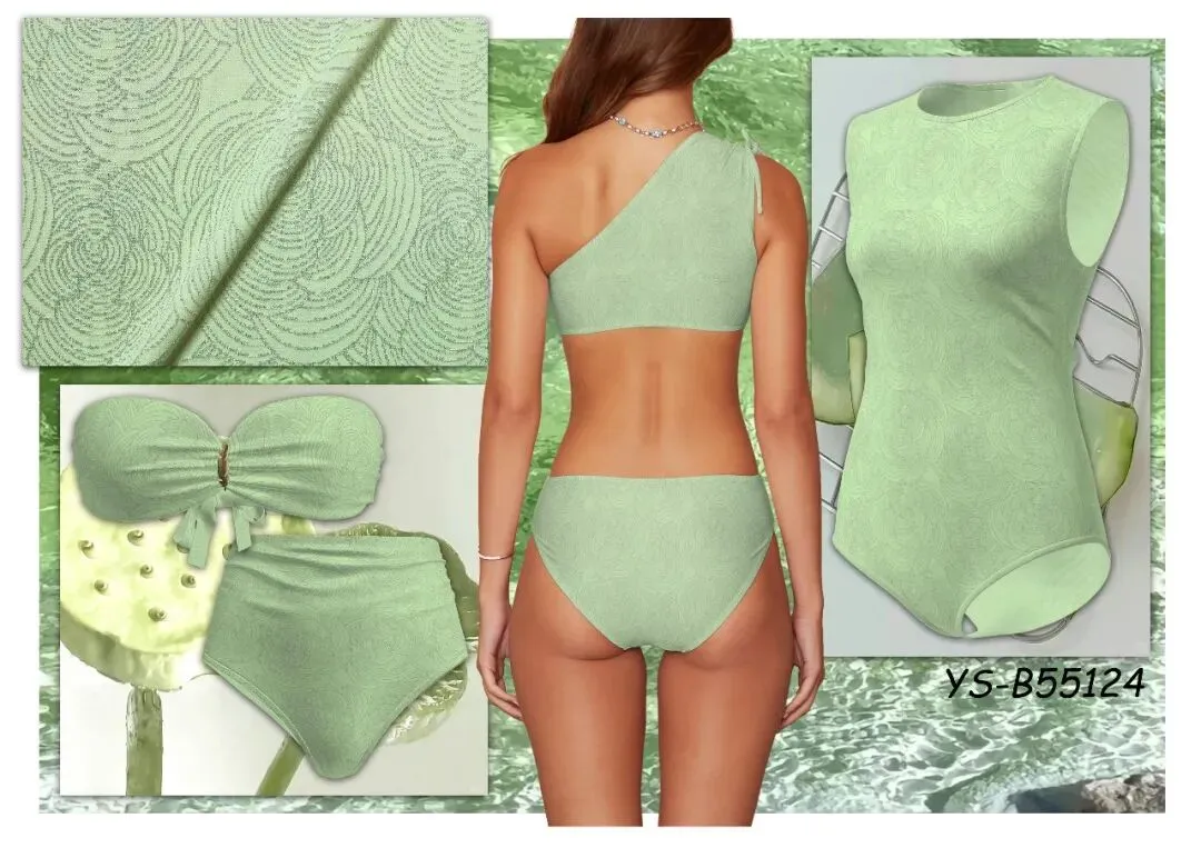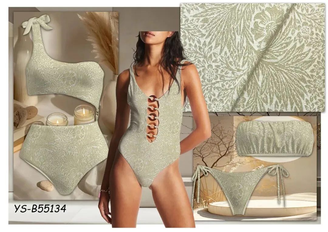 春夏泳衣的 “氛围感密码”,藏在低饱和色系的面料设计里 —— 肌理的层次、提花的细节、配色的柔和度,让面料本身就成为视觉焦点。今天给设计师们拆解 5 组低饱和系面料,聚焦肌理工艺与配色巧思!