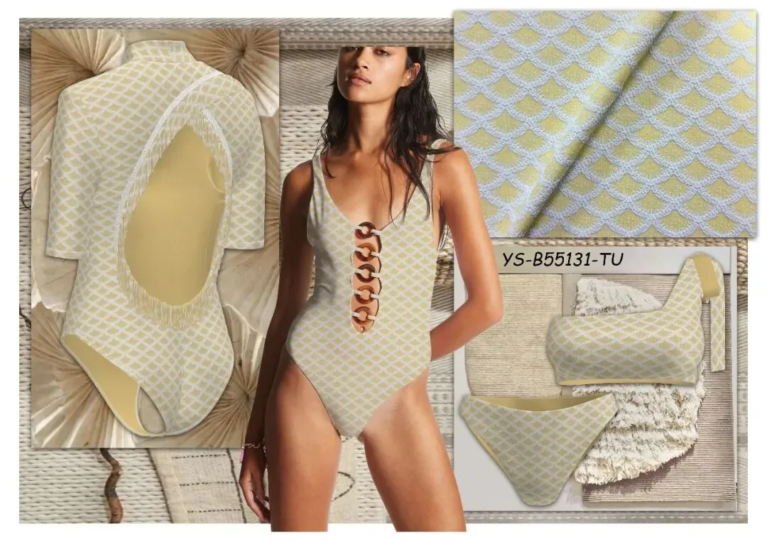 • 配色设计:浅米黄 + 白色的低饱和组合,色调柔和不挑肤色,适配极简、休闲等多风格泳衣,还可延伸做发圈等配饰面料。