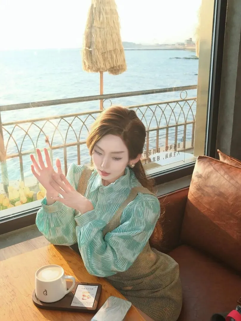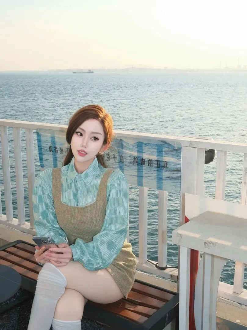.型选择了半.扎发,.既有.少女感又.不会显.得过于随意.。脚.上的米白色.长袜和整体.色调和.谐统一,.又增.加了层次感.。她.坐在长椅上.,海.风轻.轻吹动发丝.,脸.上带着.温柔的微.笑,真的是.氛围感拉满.。这种穿搭.适合在.海边散步、.看日.落,.随便一拍都.是大.片。