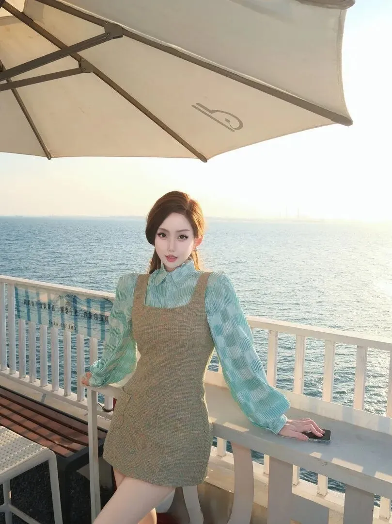 第三.套穿搭.主打.舒适自.在的度.假感,薄.荷绿格.纹衬衫搭配.花呢背带.裙,既有春.天的.清新感.又不.失精致.。花.呢材质的.背带裙增加.了穿.搭的层次感.,让整体.造型不会.显得单调。.女孩.站在海.边露台,.海风轻轻.吹动裙摆,.仿佛自带滤.镜。
