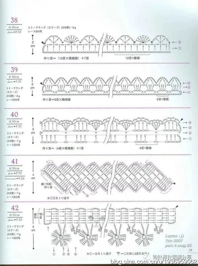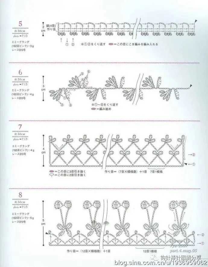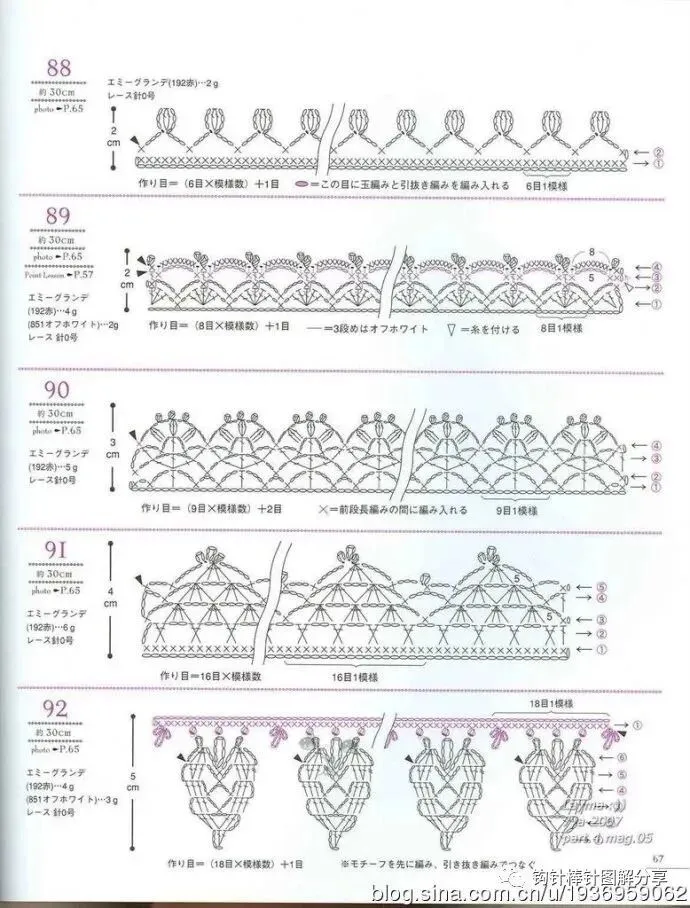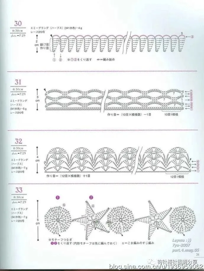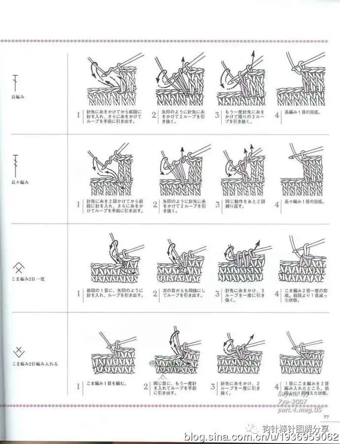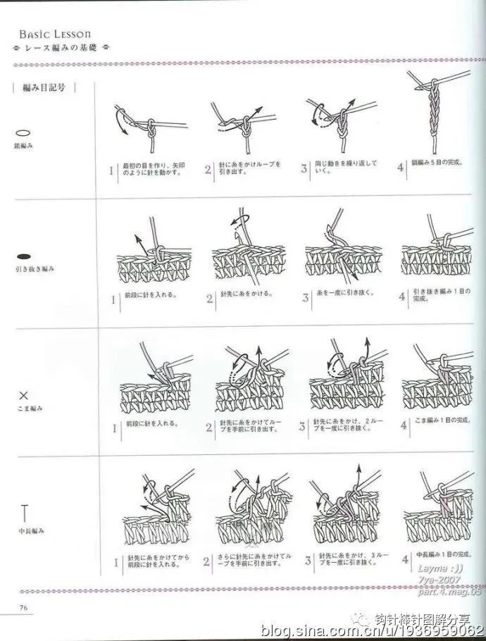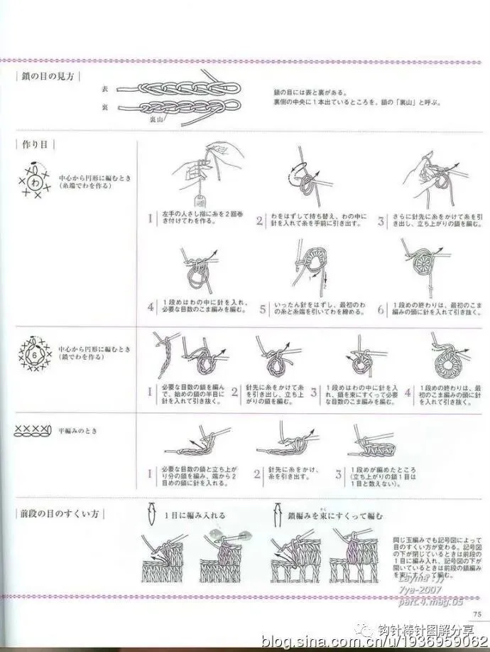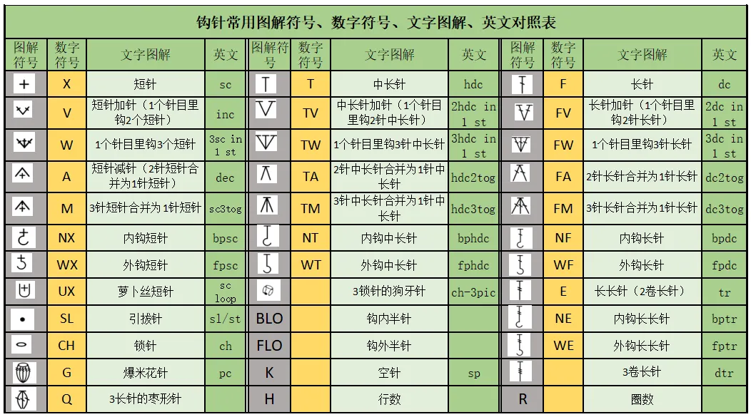 4、钩针图解一般分为图形图解和文字图解,初接触的常常会被各种钩针符号搞的头大,为了更好更快地看得懂各种图解,我整理了一下常用的钩针符号图解和文字图解的对照表,见文末,希望对你有所帮助。