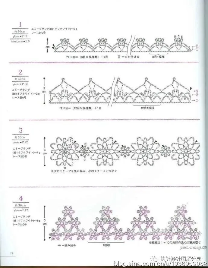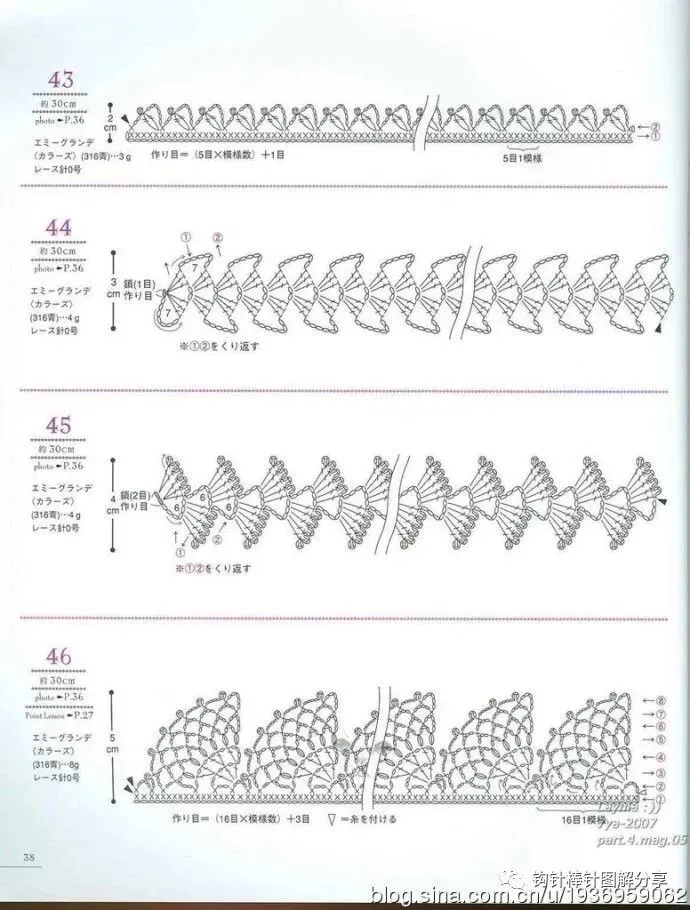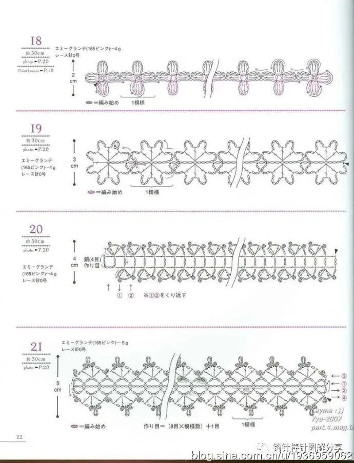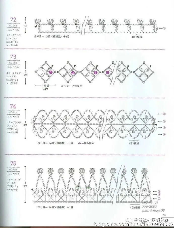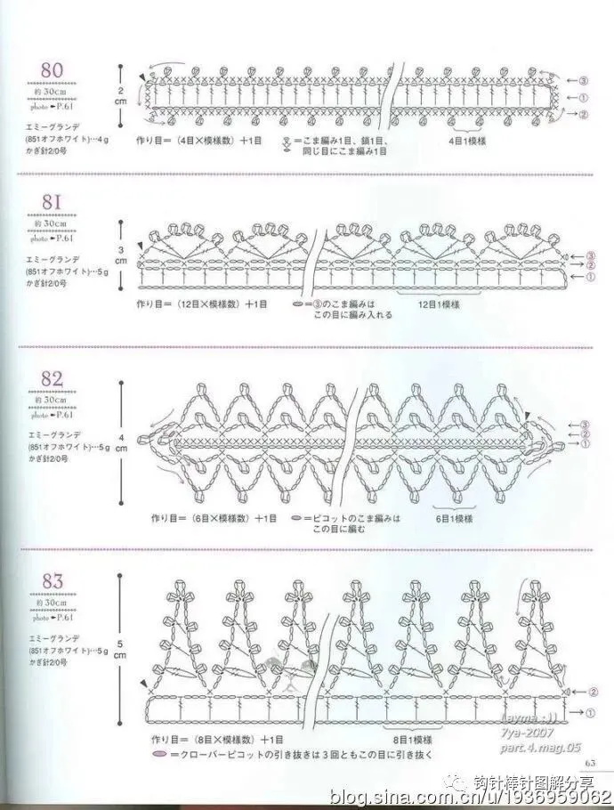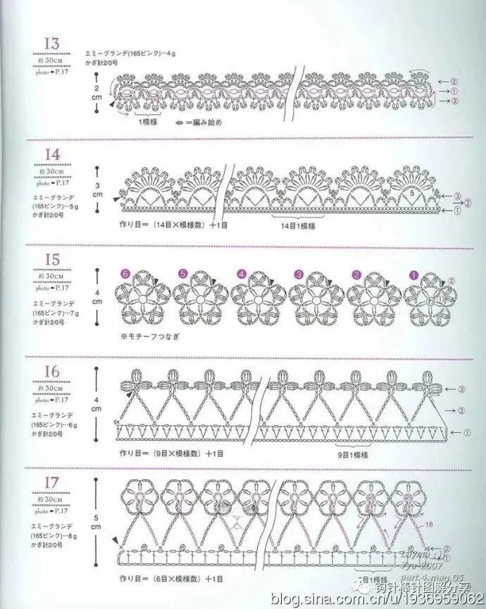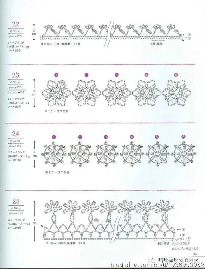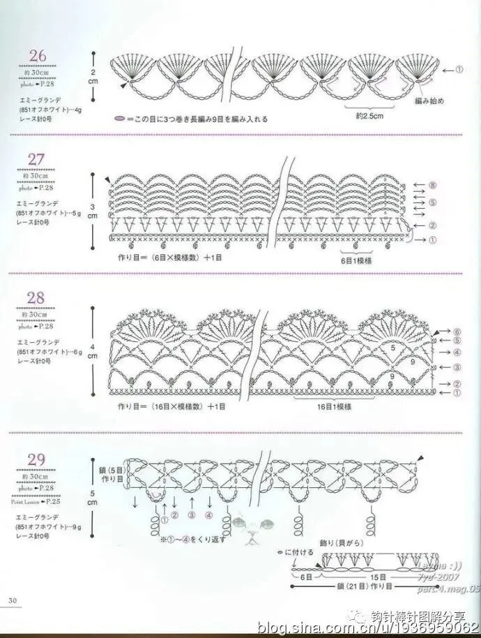 4、钩针图解一般分为图形图解和文字图解,初接触的常常会被各种钩针符号搞的头大,为了更好更快地看得懂各种图解,我整理了一下常用的钩针符号图解和文字图解的对照表,见文末,希望对你有所帮助。