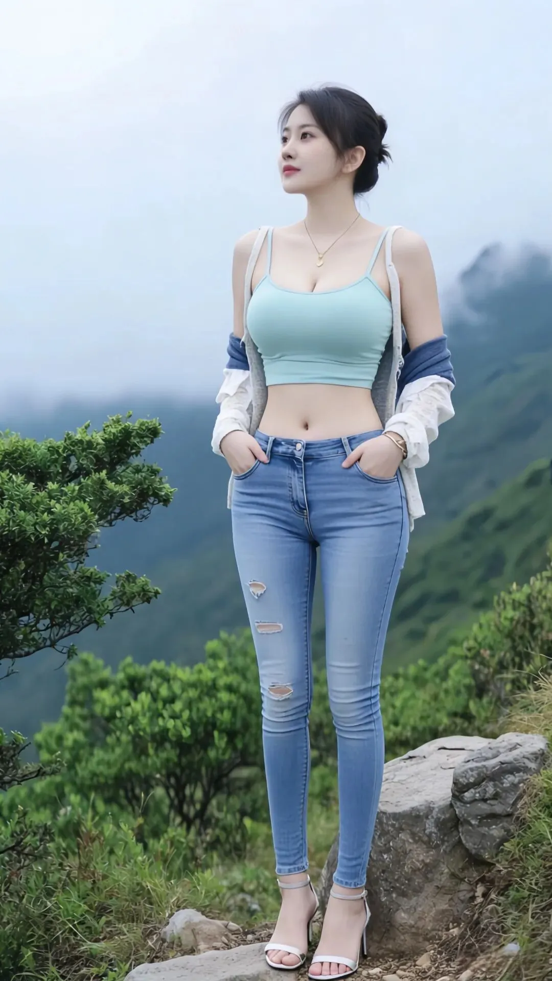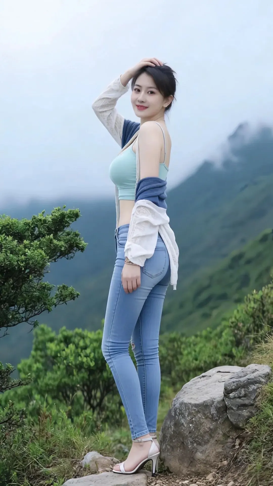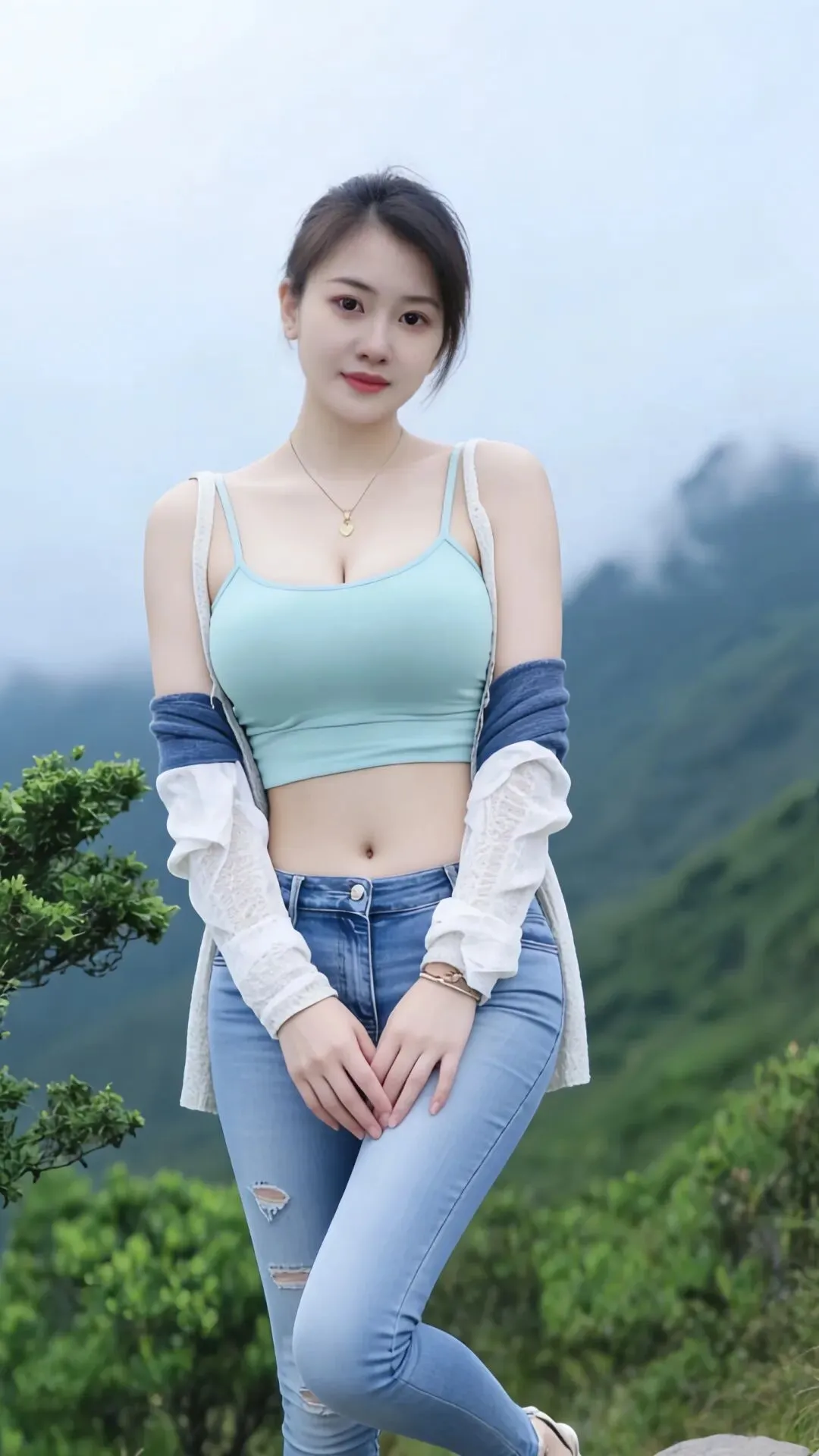 今天,就让我们沉浸式地解析一套堪称“山间穿搭范本”的组合——薄荷绿吊带、浅蓝破洞牛仔裤、白色蕾丝开衫,看看它是如何将清新、活力、温柔与随性完美编织,穿出毫不费力的高级感。