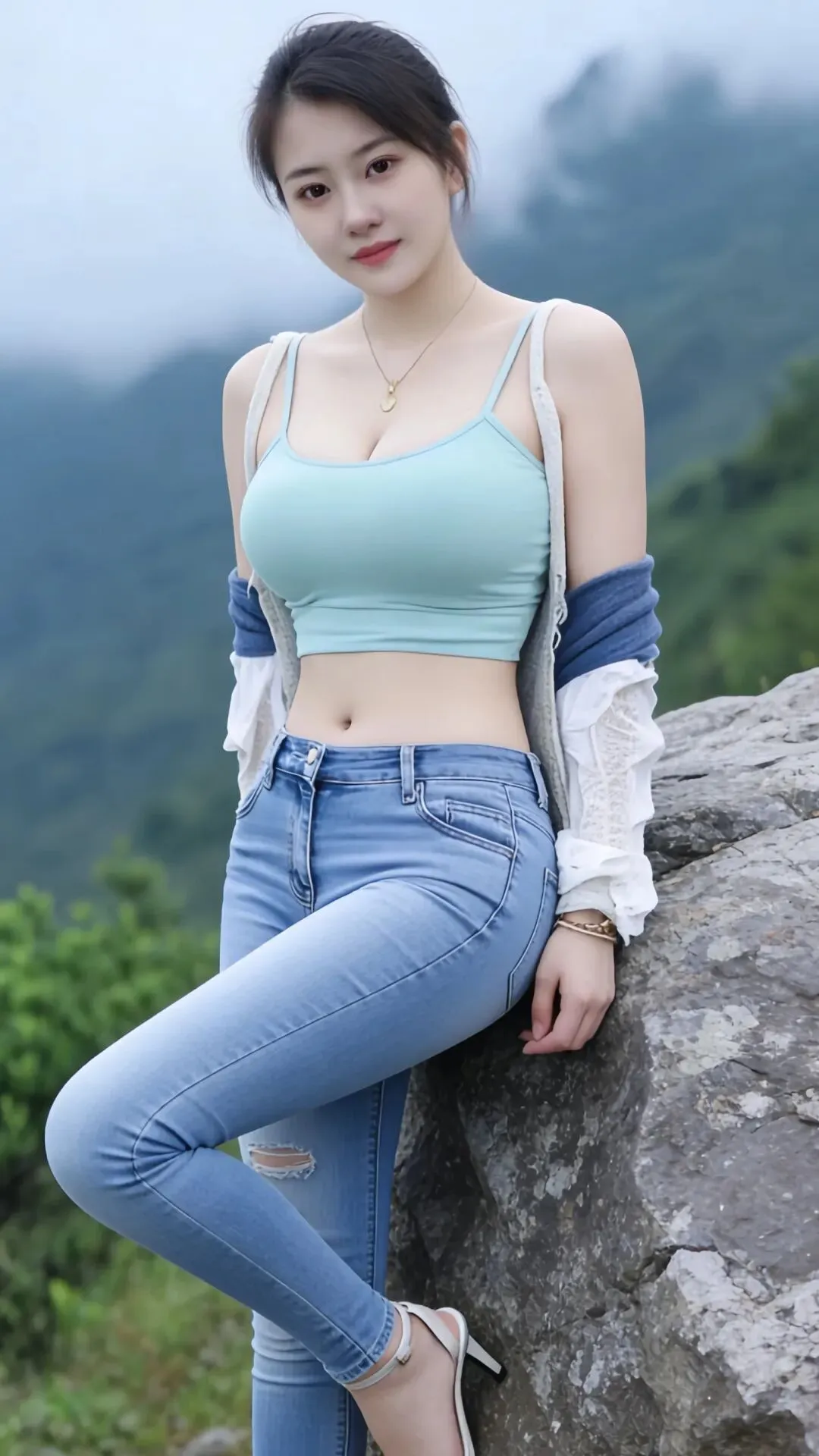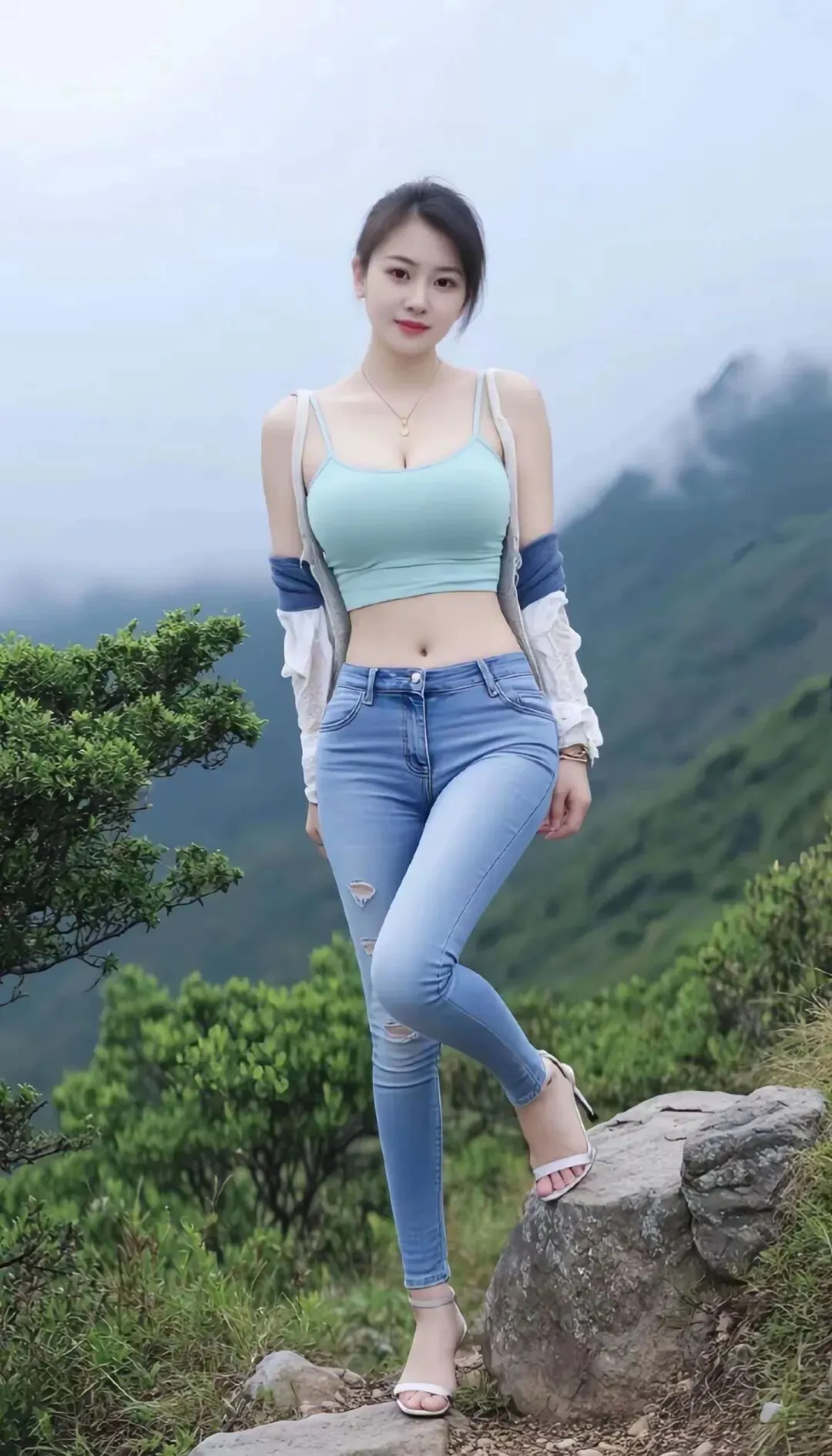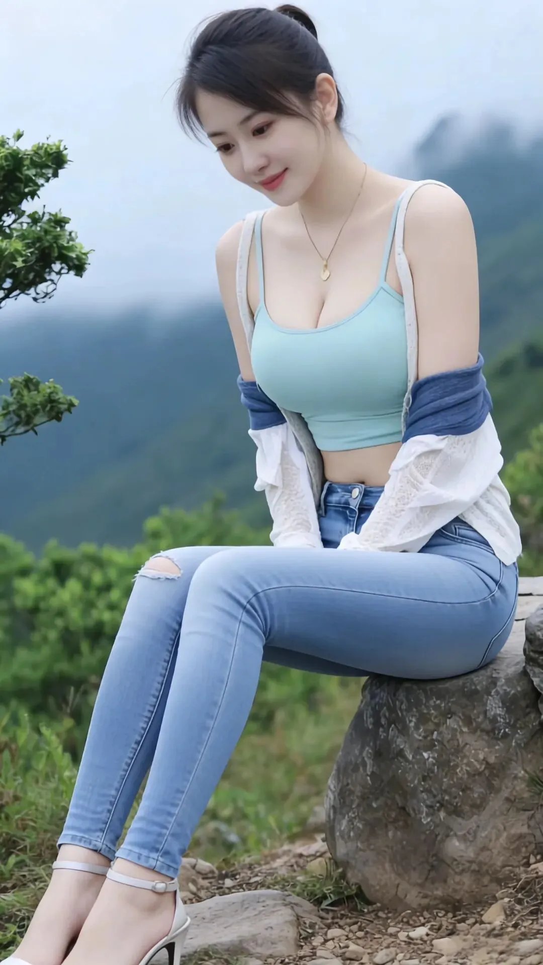 今天,就让我们沉浸式地解析一套堪称“山间穿搭范本”的组合——薄荷绿吊带、浅蓝破洞牛仔裤、白色蕾丝开衫,看看它是如何将清新、活力、温柔与随性完美编织,穿出毫不费力的高级感。