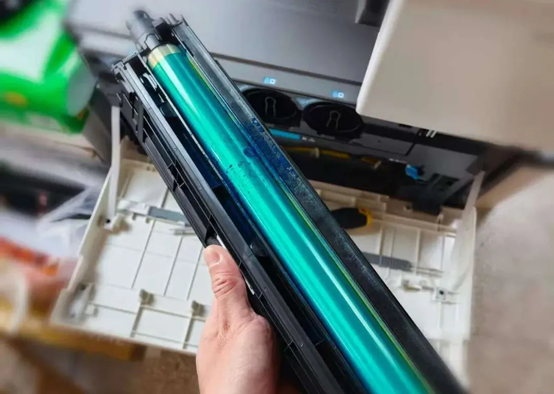 如下图掉粉之情形,大概率显影仓铁粉堆积,不管啥品牌复印机,基本原理大致是相似的。所谓一通百通,我们说干就干。
