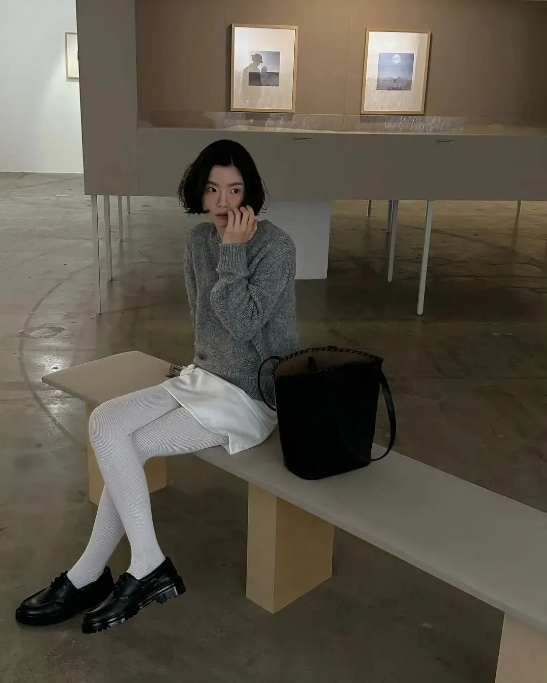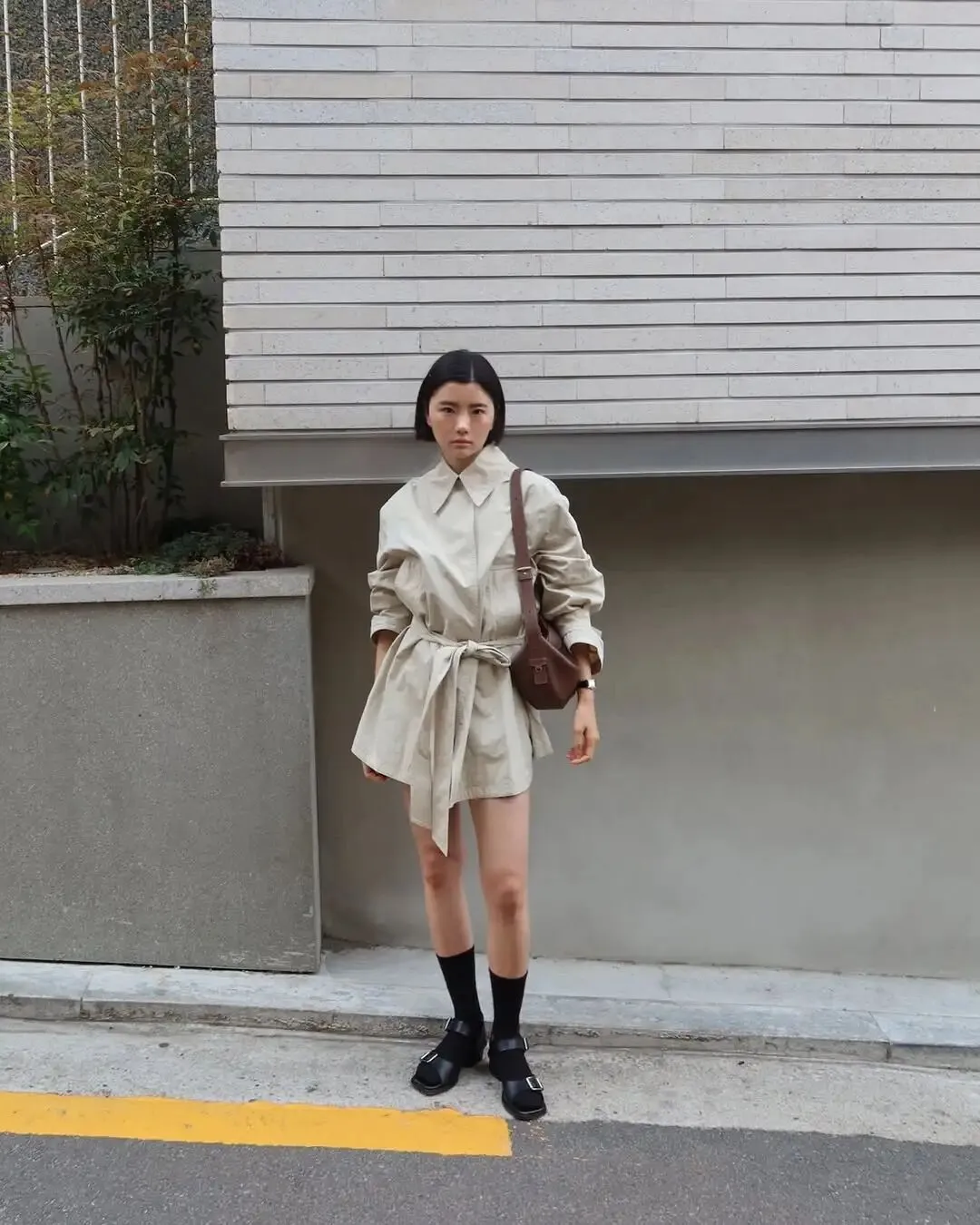 小个子的穿搭需要一些呼吸感才能让造型看上去轻盈,凸显身材的优势,她在穿搭中选择透色的丝袜来作为过渡,视觉上自带柔光,同时也能平衡身材比例。