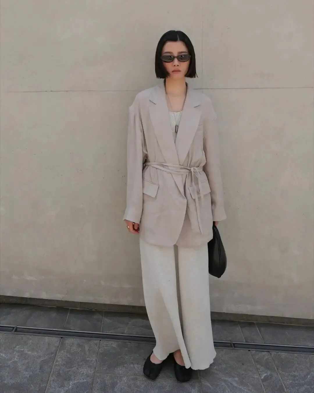 束腰是小个子们最好的朋友,但要注意不要选择复杂或宽的腰带,会让造型分割的更难驾驭,简单的细绳就能微调身材比例,拉长腿部线条,提高腰线,同样的道理在廓形西装上也适用。