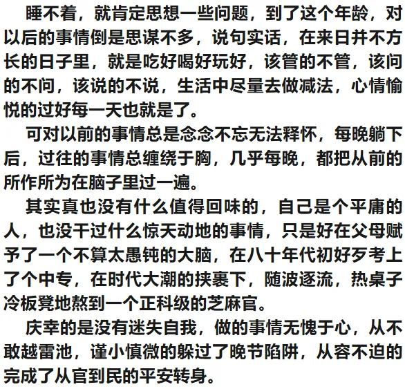 前年四月份,我从县农业农村局长的位子上退休,过起了清静悠闲的日子,像大多数老年人一样,前三十年睡不醒,后三十年睡不着。无法治愈的失眠成了大问题。