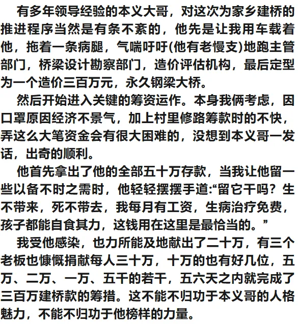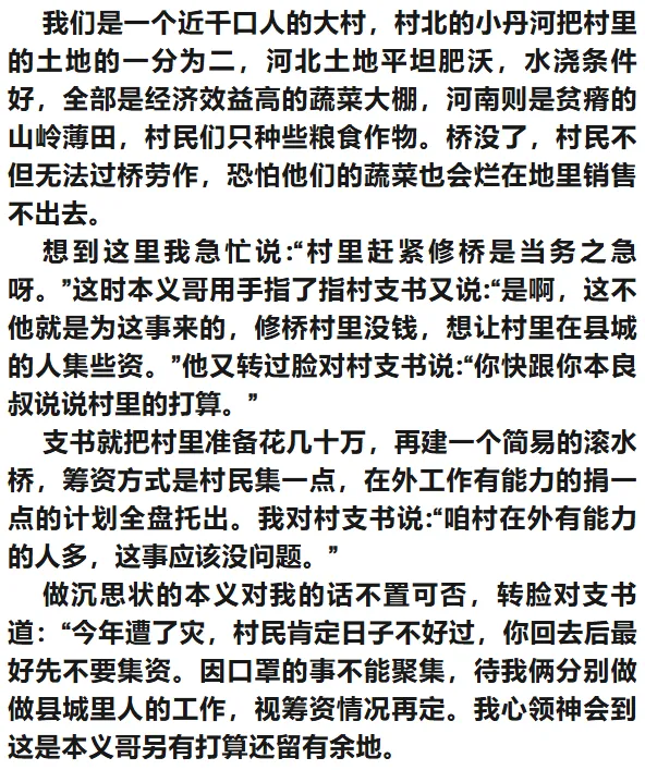 村支书走后,本义大哥语重心长地对我说了下面一段话:“本良啊,出来这么多年,没给家乡干一点像样的事,我心里惭愧呀,到了生命的最后,我想给老家里的人留下些印记,也不枉此生啊。老家的这座桥从我记事起,冲毁了不下四五次,我想这次咱们在外的人努努力,为家乡建座抗御百年洪水一遇的钢梁大桥,不知是否能达成啊,建这样的桥起码要几百万哪。最好不要村里人集资了,这里边的道道你懂得。”