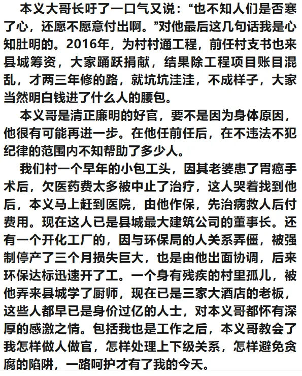 回望这几十年的仕途宦海,唯一让我感到遗憾失落,心里无法平衡的是,我退休后去年为村里做的一次公益,虽我竭尽了全力,可结局是出财出力不讨好,还得罪了村干部挨了村民的辱骂,这不能不说是我人生中的最大败笔。