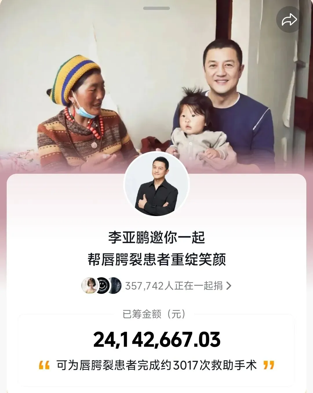 李亚鹏称,“最近很多自媒体把关注点都放在了我个人的身上,就此我想说两句嫣然的故事,它绝不是我,也不是一个人的故事,应该是近百位的医护工作人员,数百位的志愿者,医护工作人员,然后数万名的捐赠人,还有数万名的唇腭裂家庭,是由他们共同来构成的。”