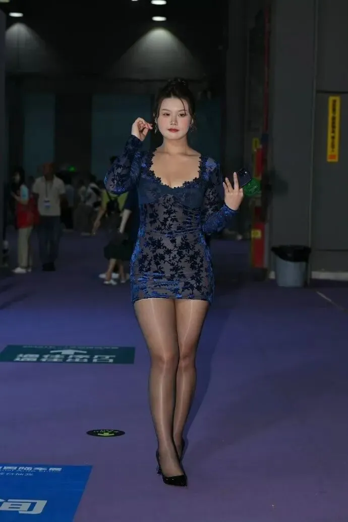 走在紫色地毯上,蓝黑蕾丝在灯光下闪着细碎的光,黑丝的油亮质感和高跟的纤细线条碰撞出奇妙的火花,手里的荧光棒成了最好的配饰,既有二次元的灵动,又有三次元的性感。