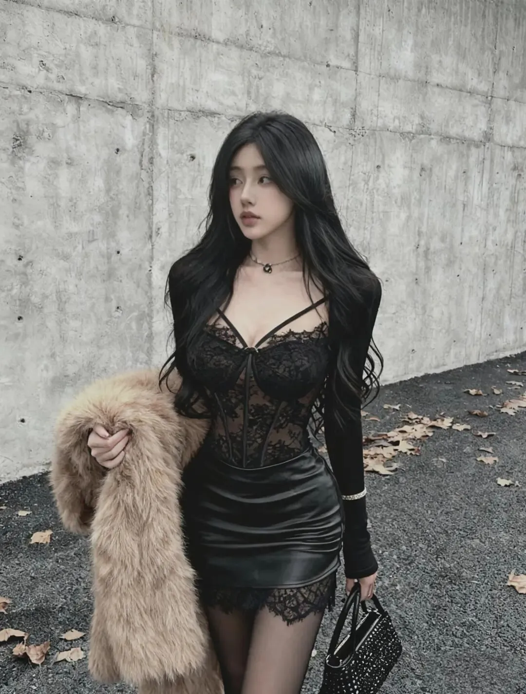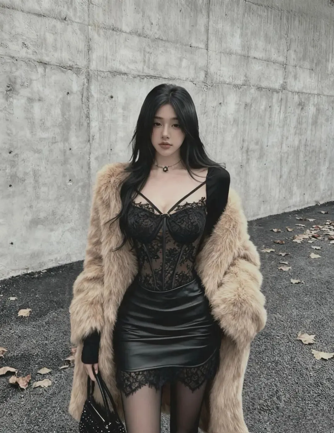 当前位置:首页>美女资讯>“黑蕾丝紧身上衣+皮质短裙+毛绒外套”,这套又酷又贵,街头直接赢麻了~