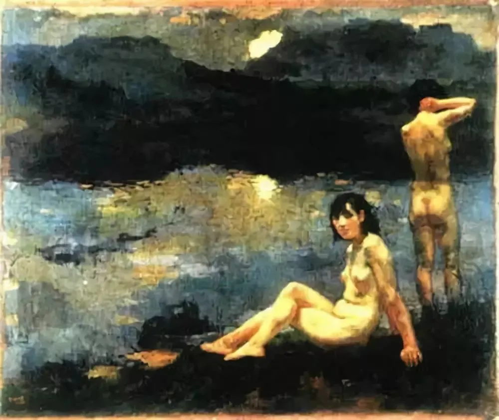 这幅《月夜》表现月光下的两个裸女,一坐一立,姿态闲适。从女人体的用光来看,当是在画室内对着模特儿写生完成,而月光、河流、草地的背景,则是想像中的景色。