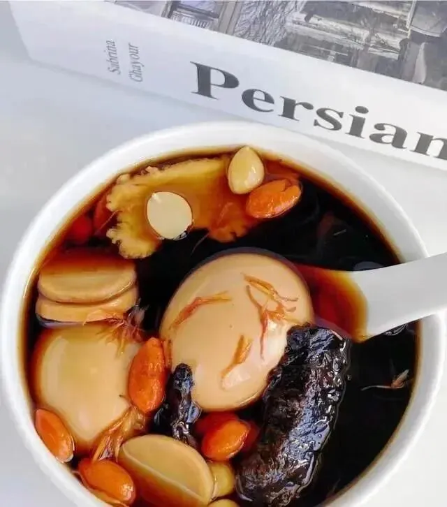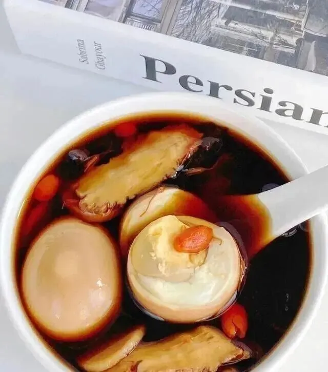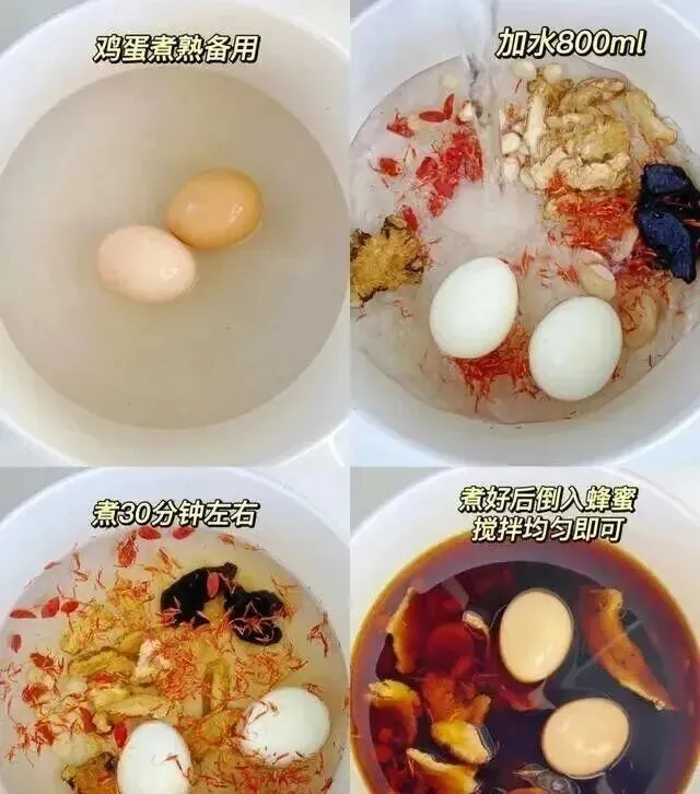 做法也简单到不行:鸡蛋先煮熟剥壳,药材洗净后和鸡蛋一起下锅,加800ml水,小火熬半小时,最后加点蜂蜜或红糖调味,一碗香喷喷的养颜汤就好了。