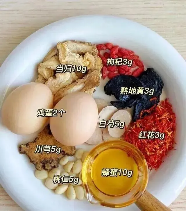 这汤的配方我已经背下来了:当归10g、白芍5g、川穹5g、熟地3g、桃仁5g、枸杞3g、红花3g,加两个煮好的鸡蛋。