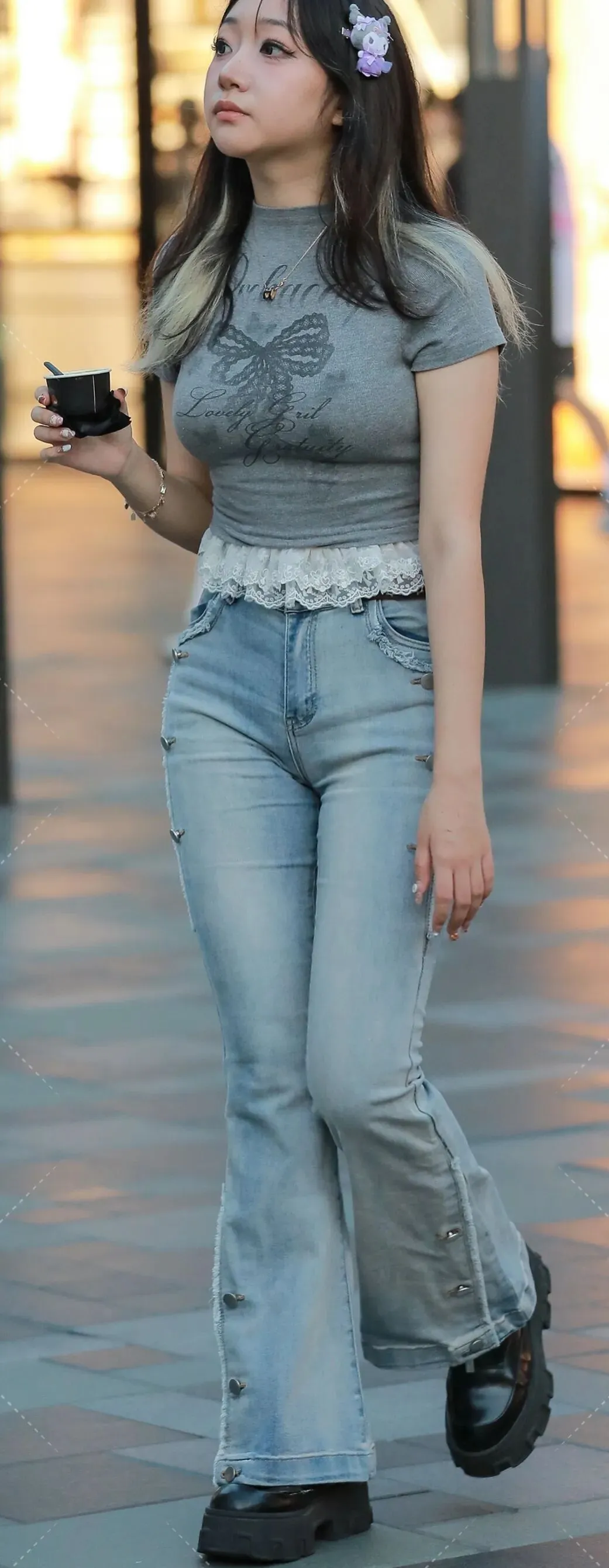 这套穿搭的核心是“甜酷平衡”。蕾丝、发饰、蝴蝶结代表的“甜”,与牛仔、厚底靴、做旧细节代表的“酷”,在色彩(浅灰、浅蓝、黑)与单品搭配中达成和谐。灰色T恤的柔和中和了牛仔的硬朗,喇叭裤的飘逸呼应了厚底靴的沉稳,而蕾丝花边与卡通发饰则是少女心的温柔锚点——没有过度甜美的腻,也没有全然酷感的冷,恰是Z世代追求的“自我风格表达”:既可以是甜美的女孩,也能是酷飒的街头玩家,两种气质在日常穿搭中自然生长。