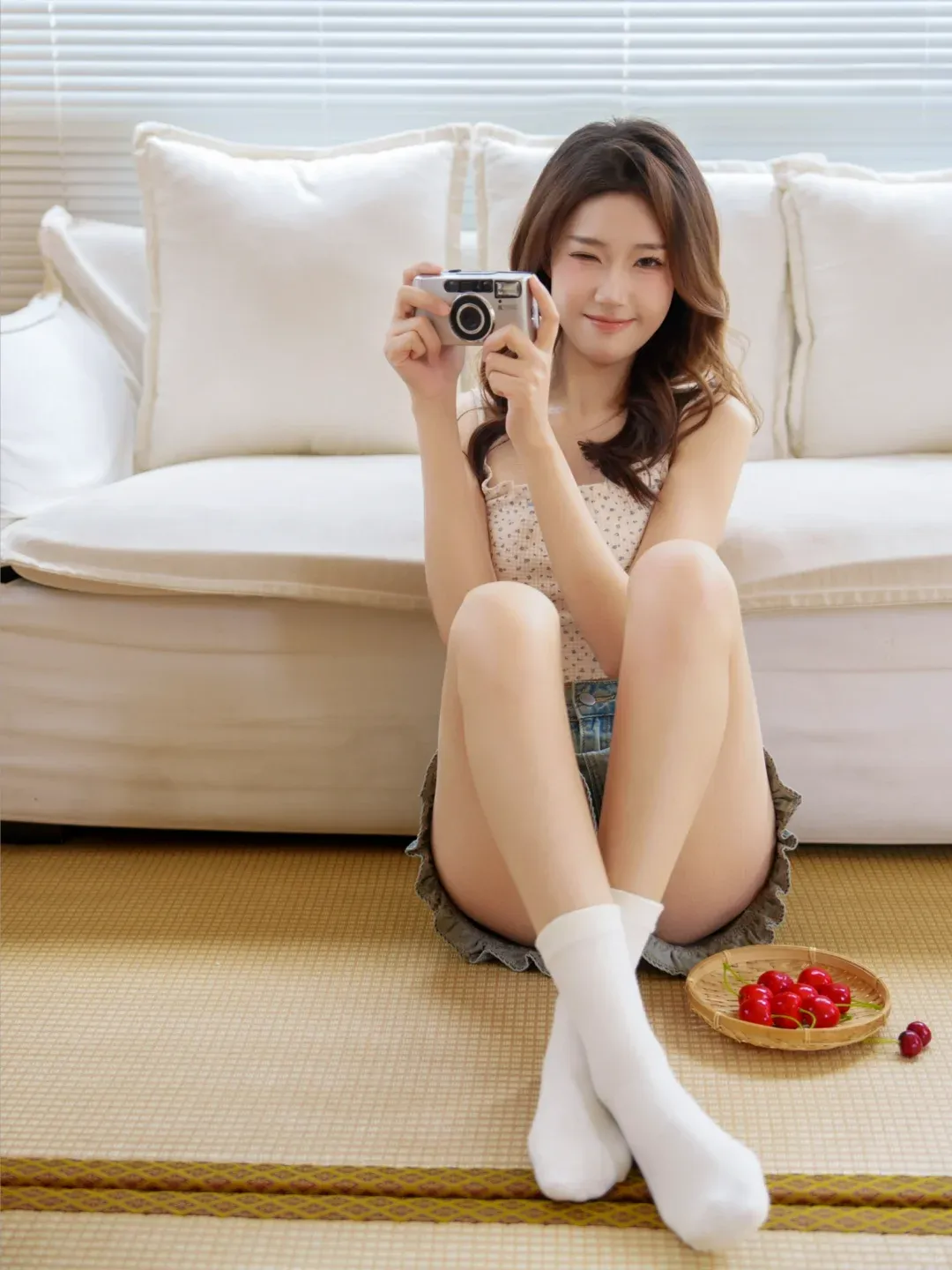双腿交叉坐在地毯上,膝盖顶到胸前,双手举着相机轻挡半张脸,对着镜头眨眼微笑,可以在旁边放一盘樱桃作为点缀,会让画面充满生活气息,拍出来的照片自然感直接拉满。