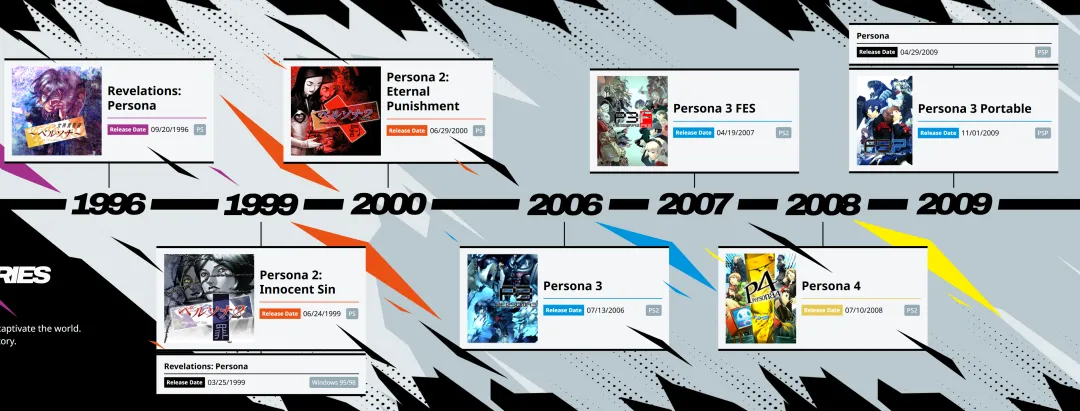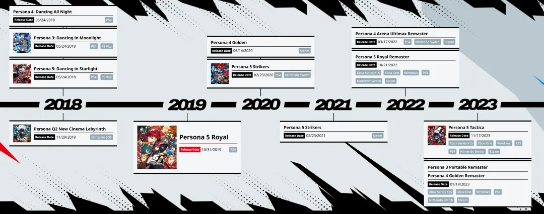 再来看看之前发布的全新主视觉,这次是按作品时间轴整齐列队~不管是从初代《Persona》的“主人公”还是到《Persona 5》的“Joker”,在画面上都统一采用鲜明色块与系列标志性的瞳孔高光,当然肯定是呼应了各自作品主题色,而且也暗藏了历年元素——P3的Evoker、P4的护目镜、P5的怪盗面具皆巧妙融入背景,玩过的老玩家只能说一眼可辨~