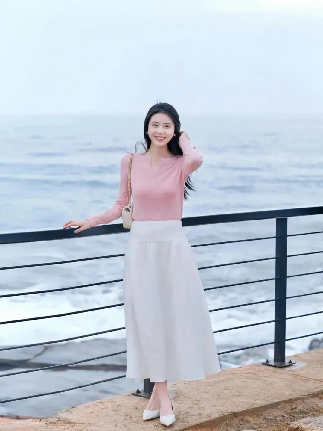 它不是俗气的亮粉,是带灰调的樱花粉针织,像把海边清晨的雾霭织进了纹理里。贴身穿软而不塌,海风拂过时不会贴在身上显臃肿,领口的小 V 设计刚好露出一点锁骨,不暴露还能修饰颈部线条,针织的细坑纹在阳光下泛着柔光,不用配项链就自带精致感,耳饰的小珍珠也被衬得更温柔。