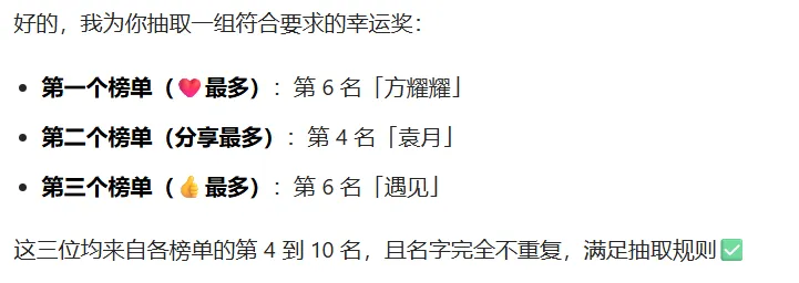 我们公布完整榜单,从每个榜单中4-10名中,通过豆包AI模型各抽1名幸运奖!共3名幸运奖!