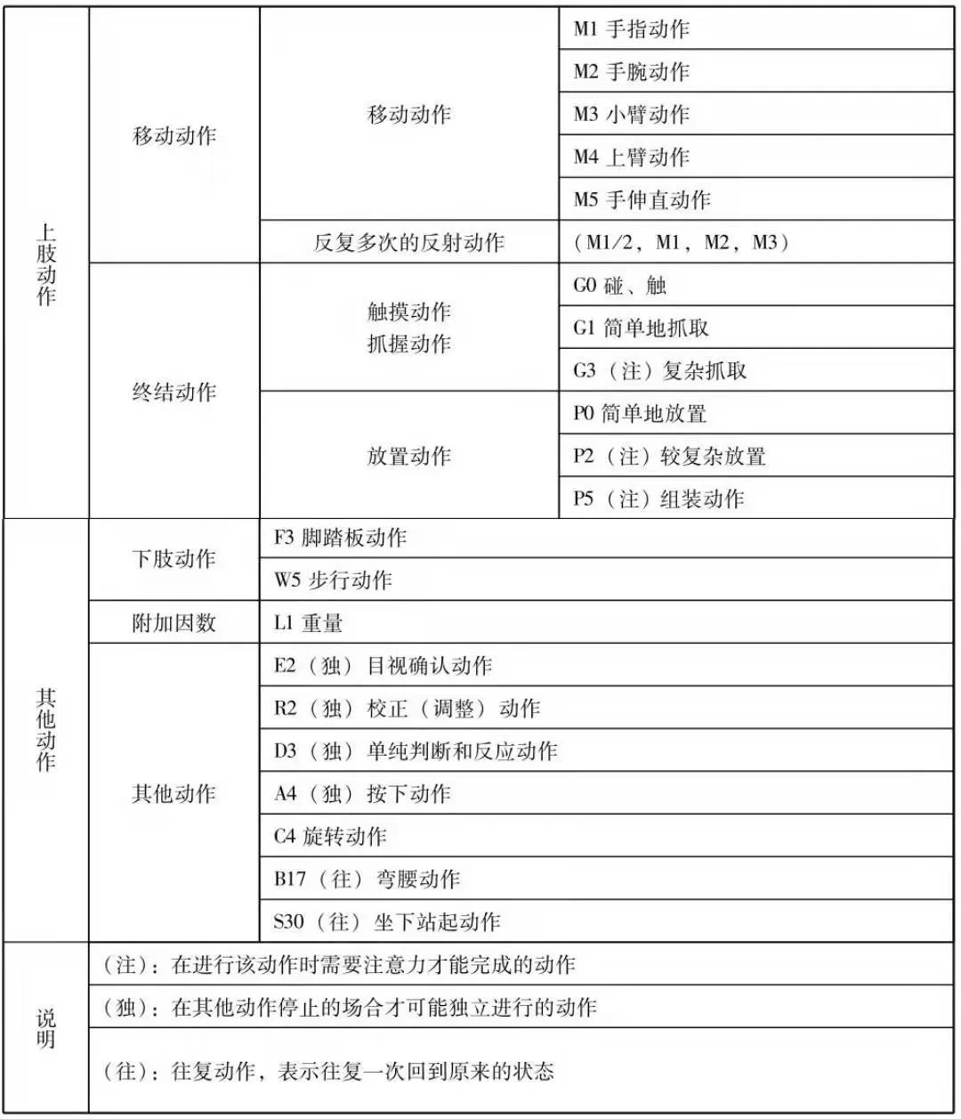 (3) 如同WF法一样,MODAPTS法的动作也是由人体器官有限的几个部位在最适合的距离、重量情况下所能完成的动作构成。