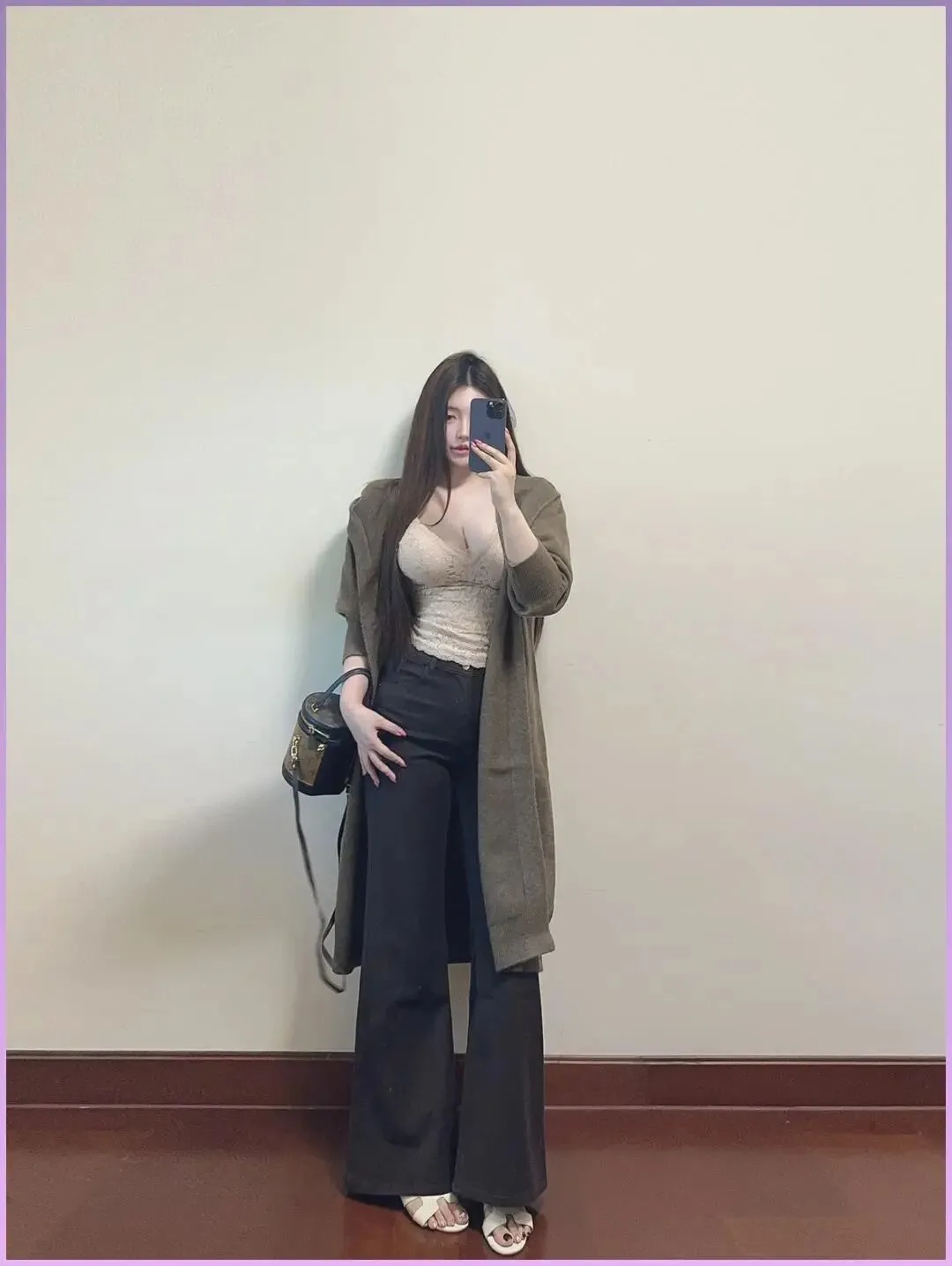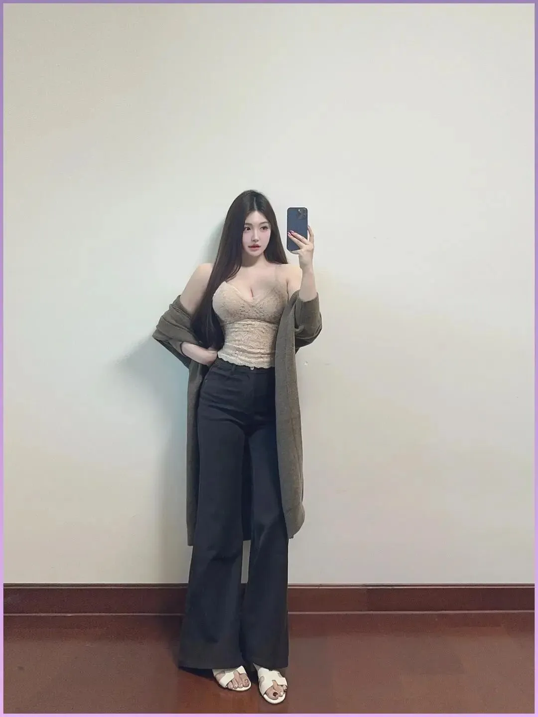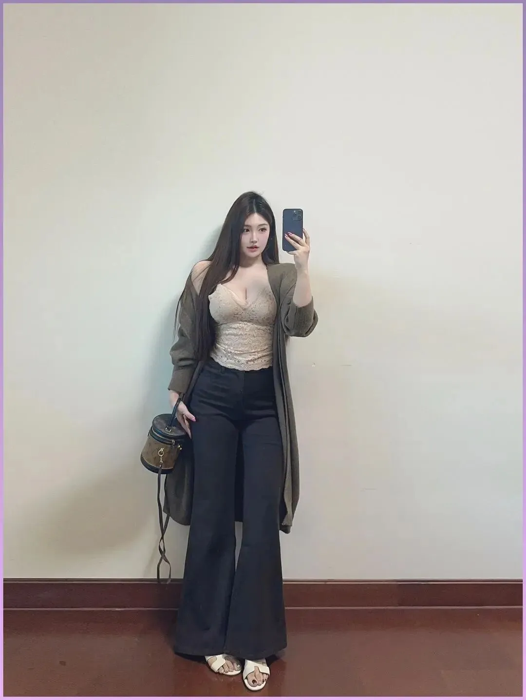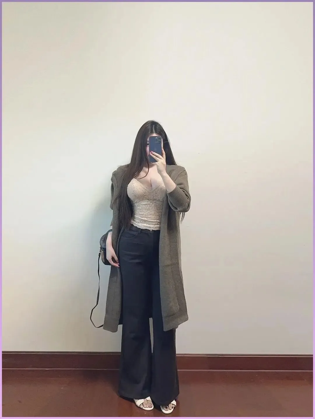 ➡ 上装:暖调蕾丝/修身背心(V领或心形领)➡ 外搭:中性色长款针织开衫,敞开穿、微露肩➡ 下装:高腰深色阔腿裤,裤长略盖鞋面➡ 鞋子:浅色凉鞋/短靴,增加轻盈感➡ 包包:小号立体包,提升精致度