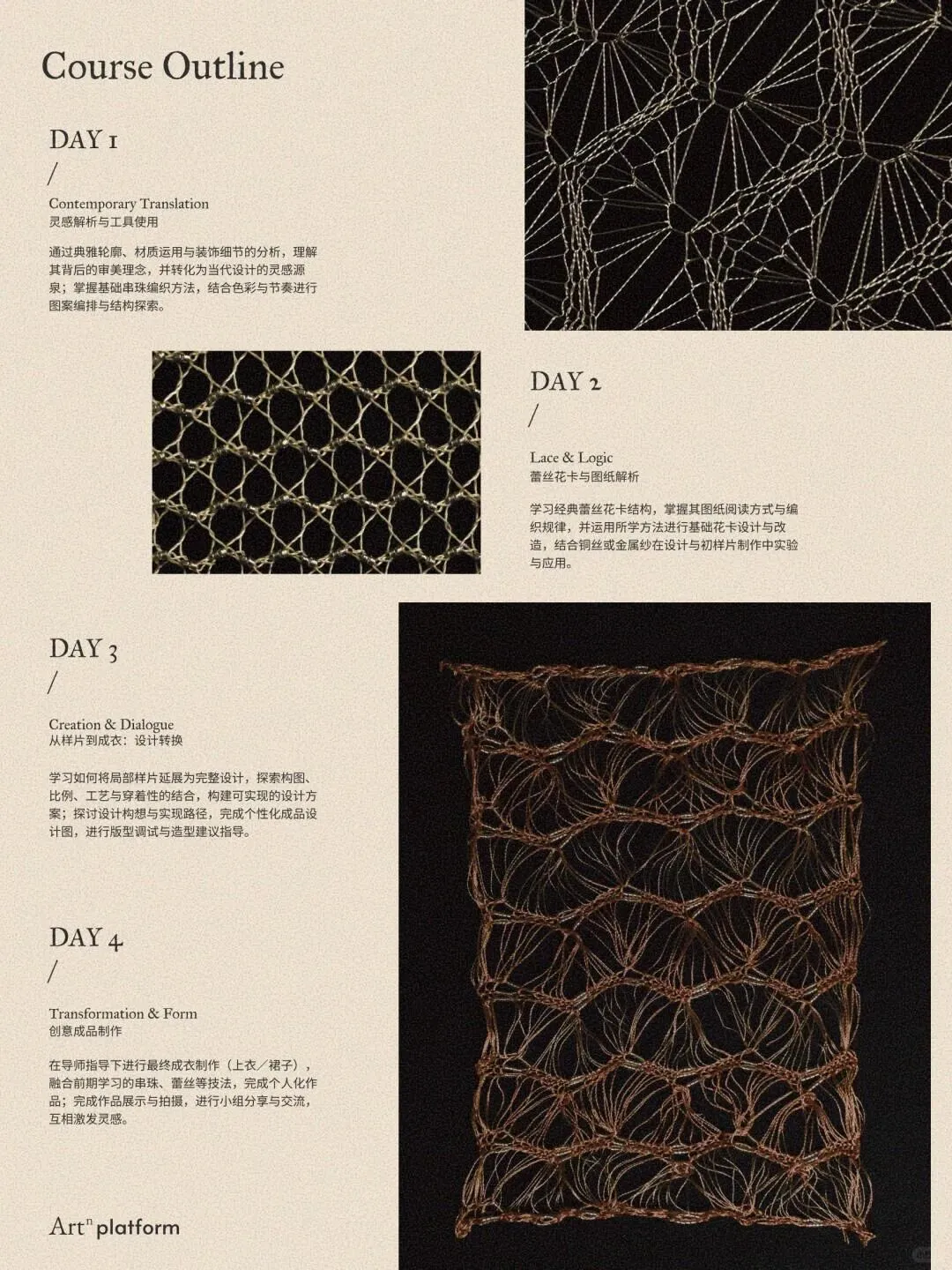 🪢由伦敦艺术大学毕业的纺织艺术家与Art N Textile 团队共同打造,她们将传统针织技法与时尚创新的设计探索与创作经验转化为教学路径,带你触摸30年代礼服中潜藏的细腻情感与工艺温度。
