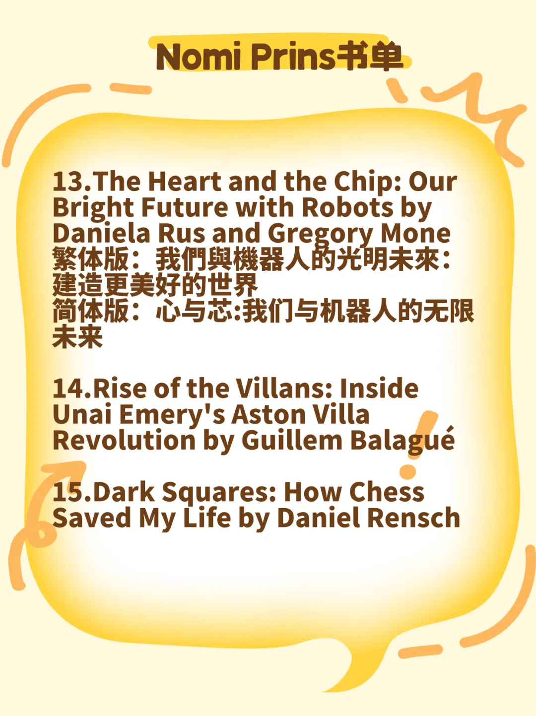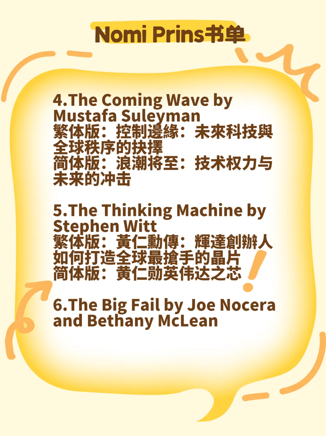 目前简体版书方便买到的就是《浪潮将至》、《黄仁勋英伟达之芯》 、《美联储传》、《绿灯》、《心与芯》,我整理了书单链接。