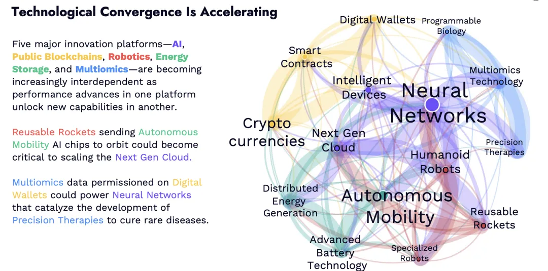 报告核心论点为:AI 是核心驱动力,正加速五大创新平台(AI、公共区块链、机器人、储能、多组学)的协同渗透,各技术间相互赋能(如可重复火箭为 AI 提供太空算力、多组学数据驱动精准医疗),推动全球经济从 “渐进式增长” 转向 “阶跃式增长”。