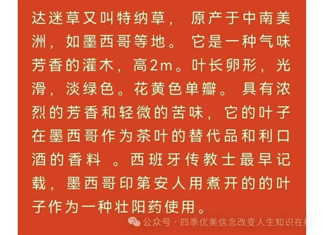 有浓烈的芳香和轻微的苦味儿。在墨西哥被作为茶叶的替代品和利口酒的香料