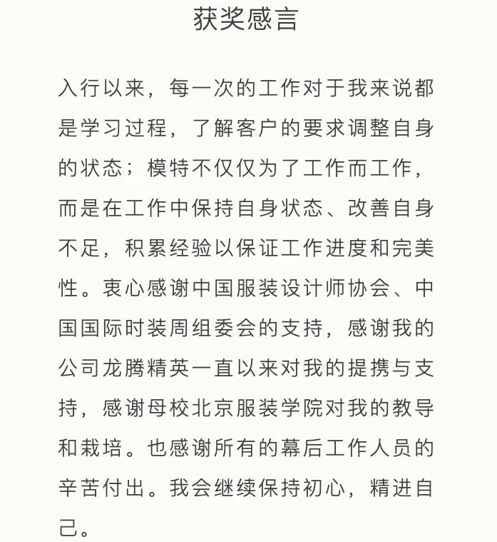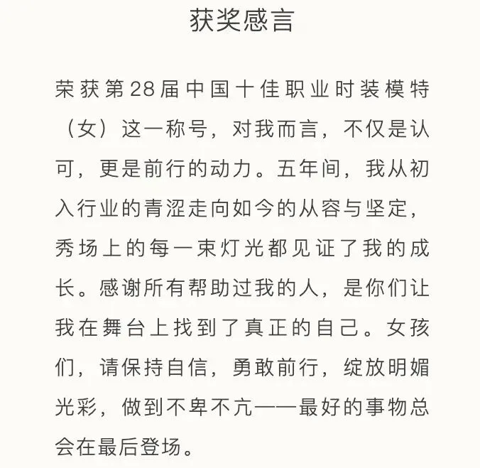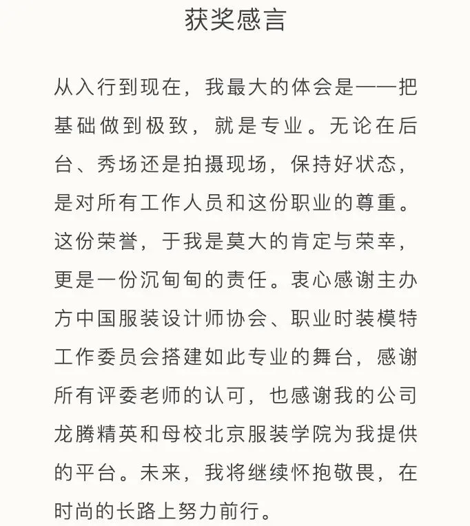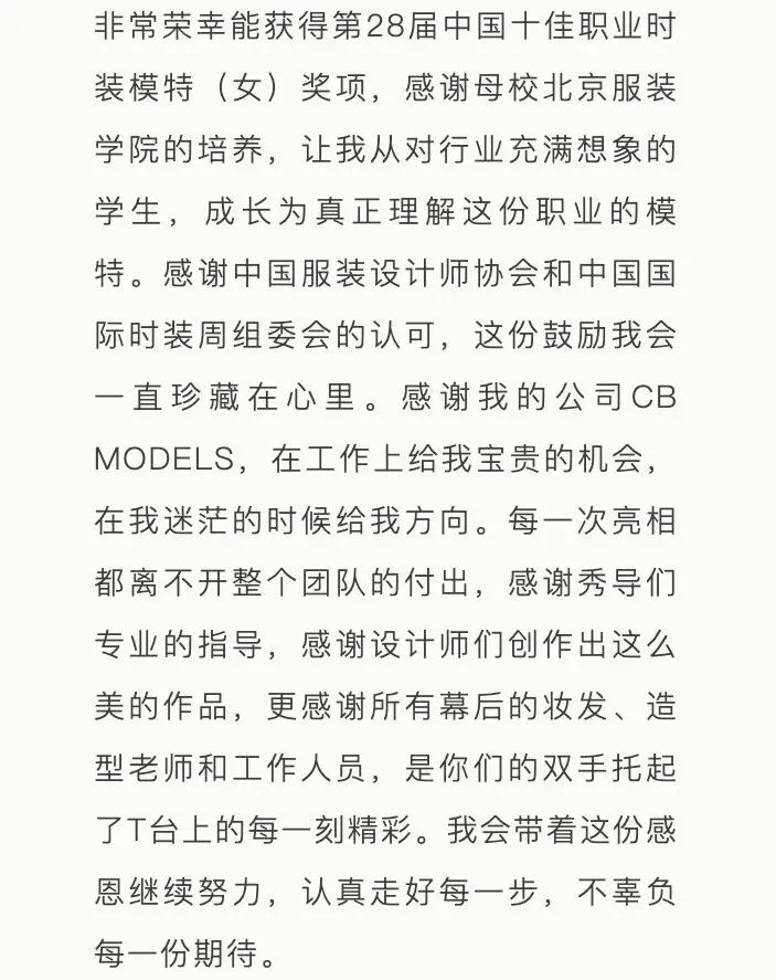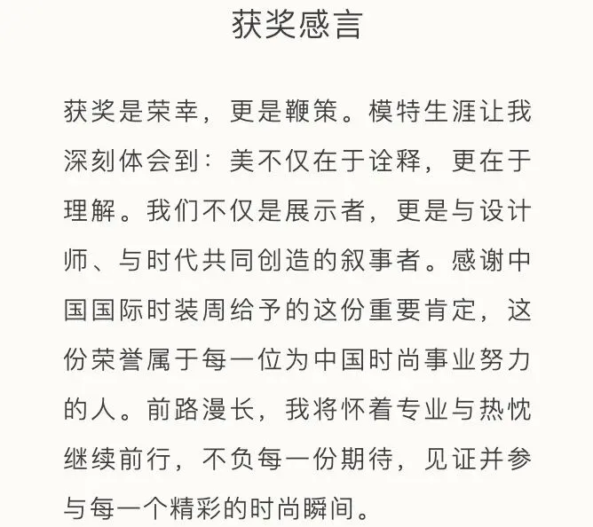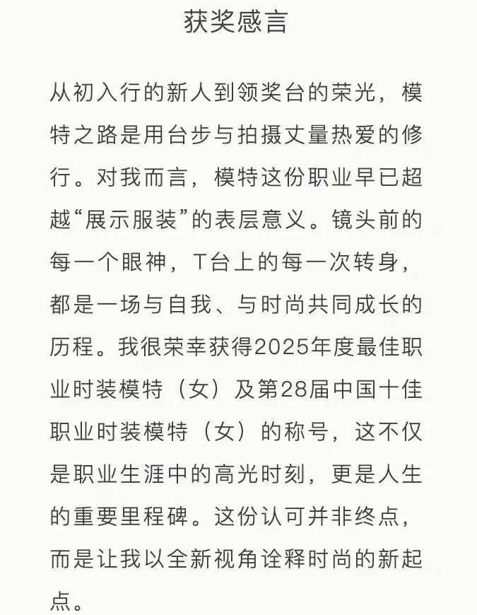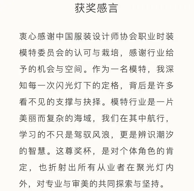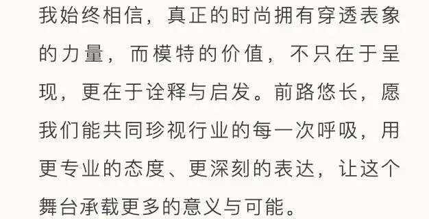 作为中国时尚模特界的至高荣誉,每年由中国国际时装周颁发的“中国十佳职业时装模特”奖项,均基于模特在国内外秀场表现、杂志拍摄及商业广告等多维度的综合表现进行评定,最终遴选出表现突出、成长潜力显著的中国模特面孔。