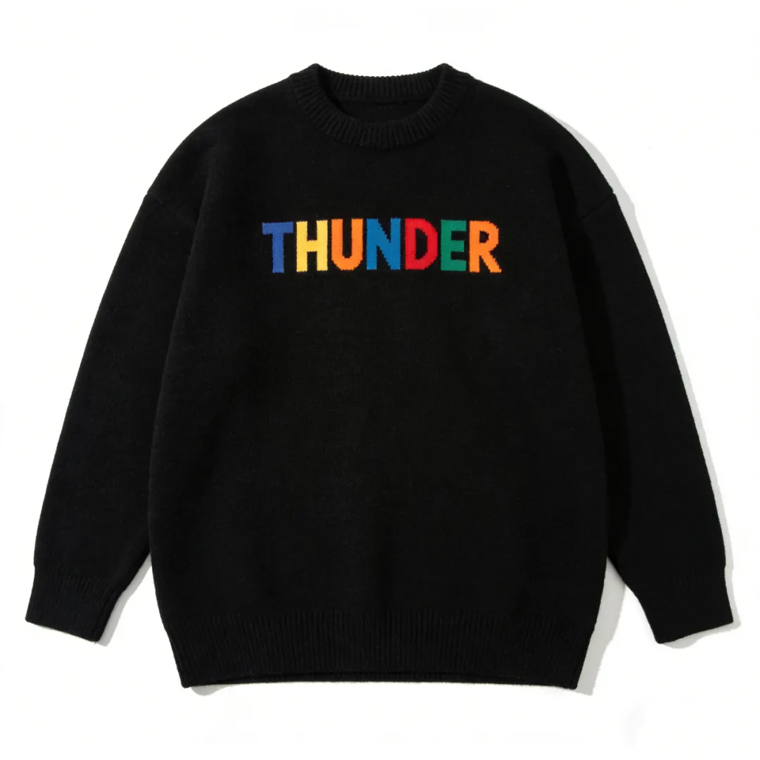 毛衣样式:这件黑色毛衣衣身点缀彩虹撞色字母提花,宽松落肩版型不挑身材,增强整体穿搭的利落感。