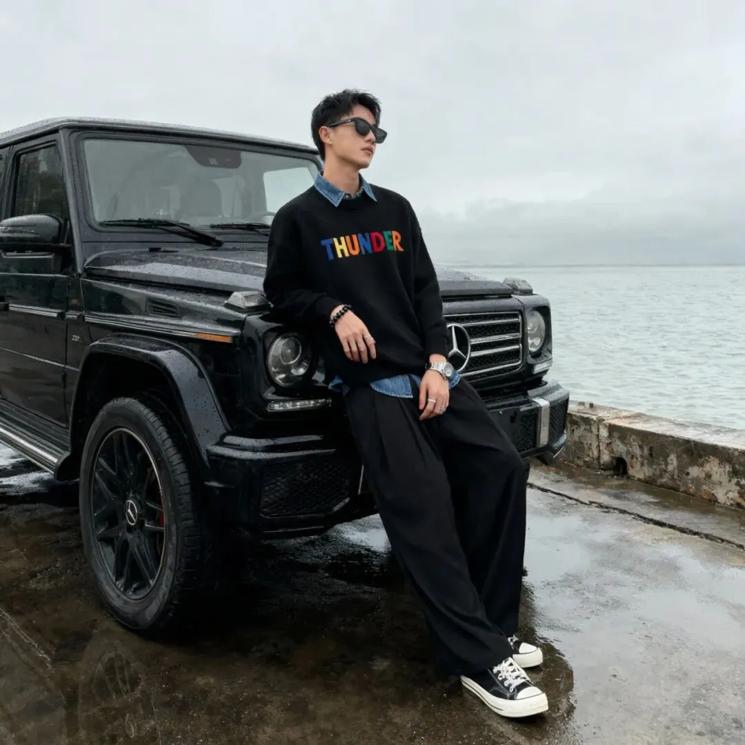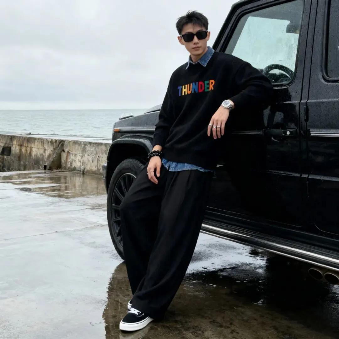 28 岁左右的帅气东亚男模特,慵懒地靠在哑光黑色奔驰大 G 车身上,场景是阴雨天的海边码头,地面潮湿反光。他穿着这件黑色带字母毛衣,内搭牛仔衬衫领。下装是黑色阔腿休闲裤,脚蹬黑白拼色低帮板鞋。配饰包括黑色墨镜、银色腕表、黑色串珠手链和银色戒指。背景是阴沉的天空、平静的海面和老旧的水泥码头。