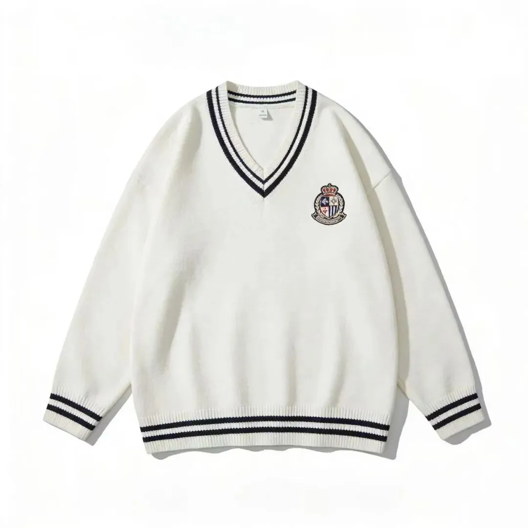 毛衣样式:米白色 V 领针织衫,V字领口拉长颈部比例,衣身纯色简约设计,搭配软糯亲肤的羊毛混纺面料,保暖又百搭,是学院风穿搭的必备单品。