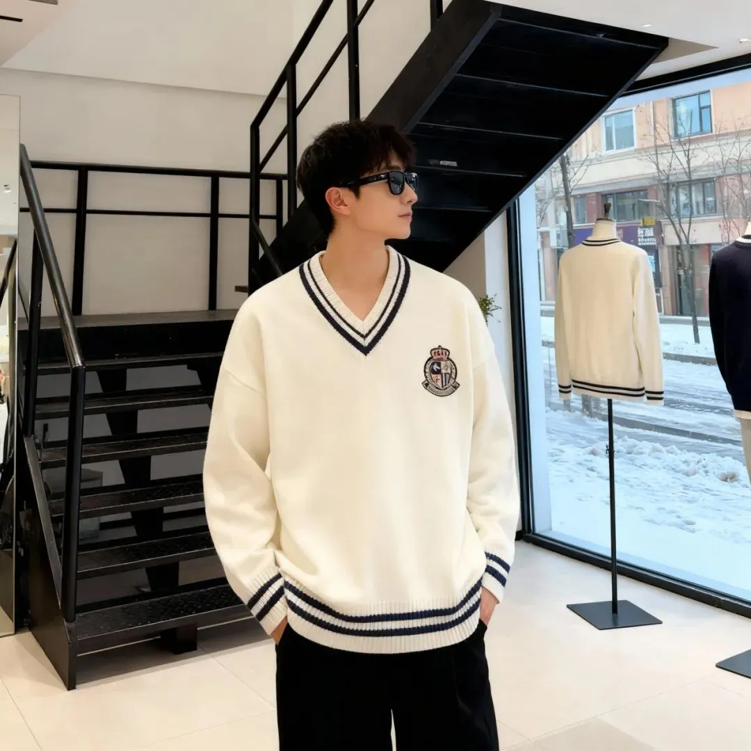 拍摄场景是轻奢男装店:背后是黑金属楼梯模特架陈列同款毛衣,窗边冬雪街景氛围浅调地砖。模特是酷感少年气质男性,戴着黑框墨镜,他身着这款学院风毛衣,双手插兜正面站姿,姿态随性。