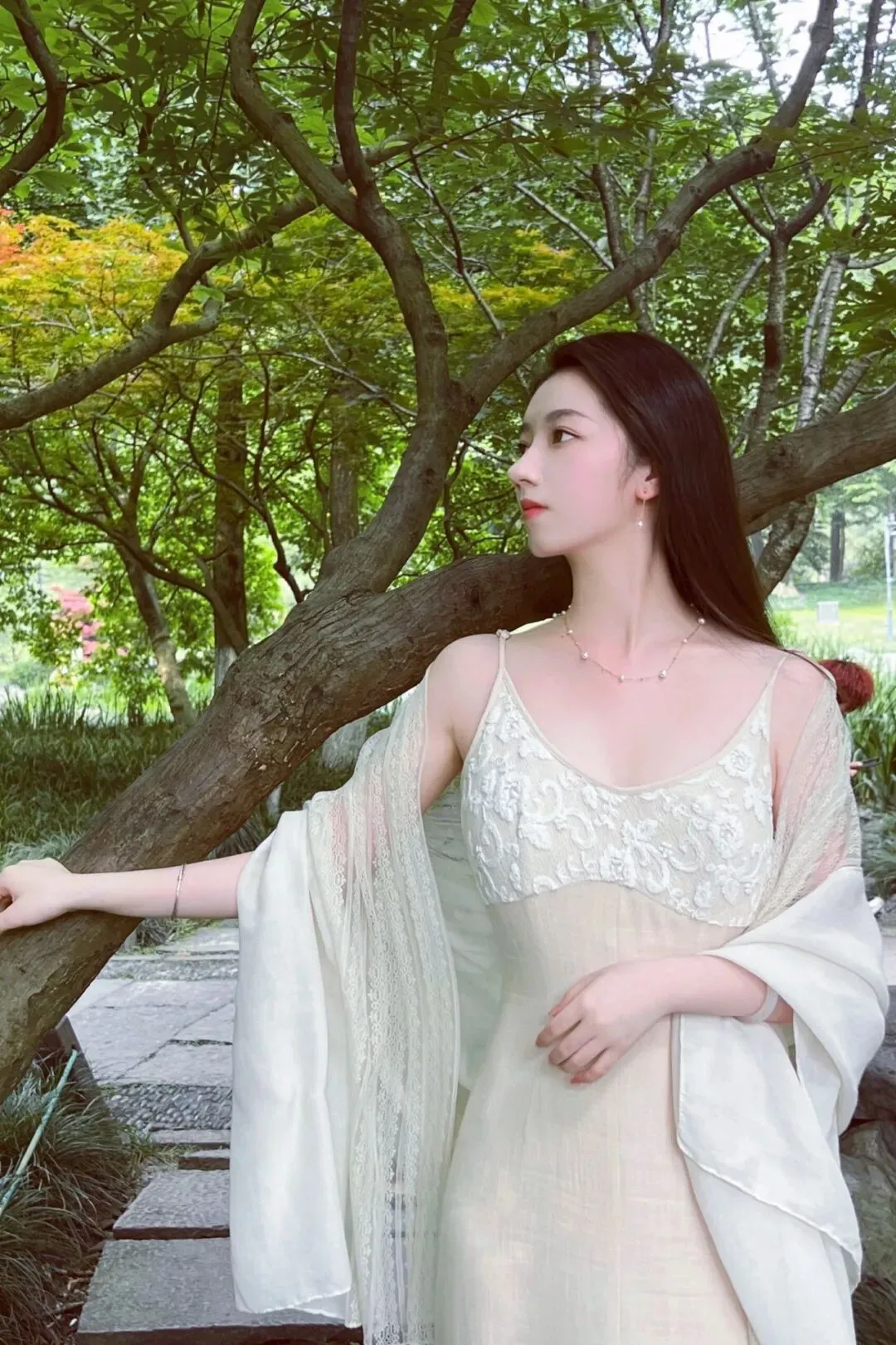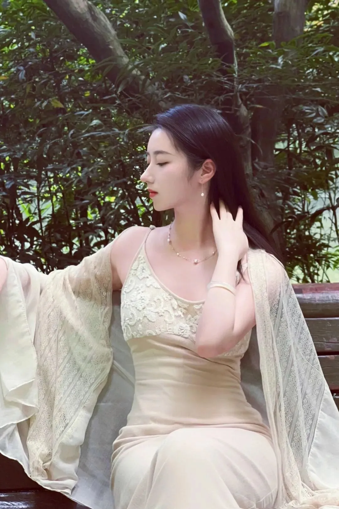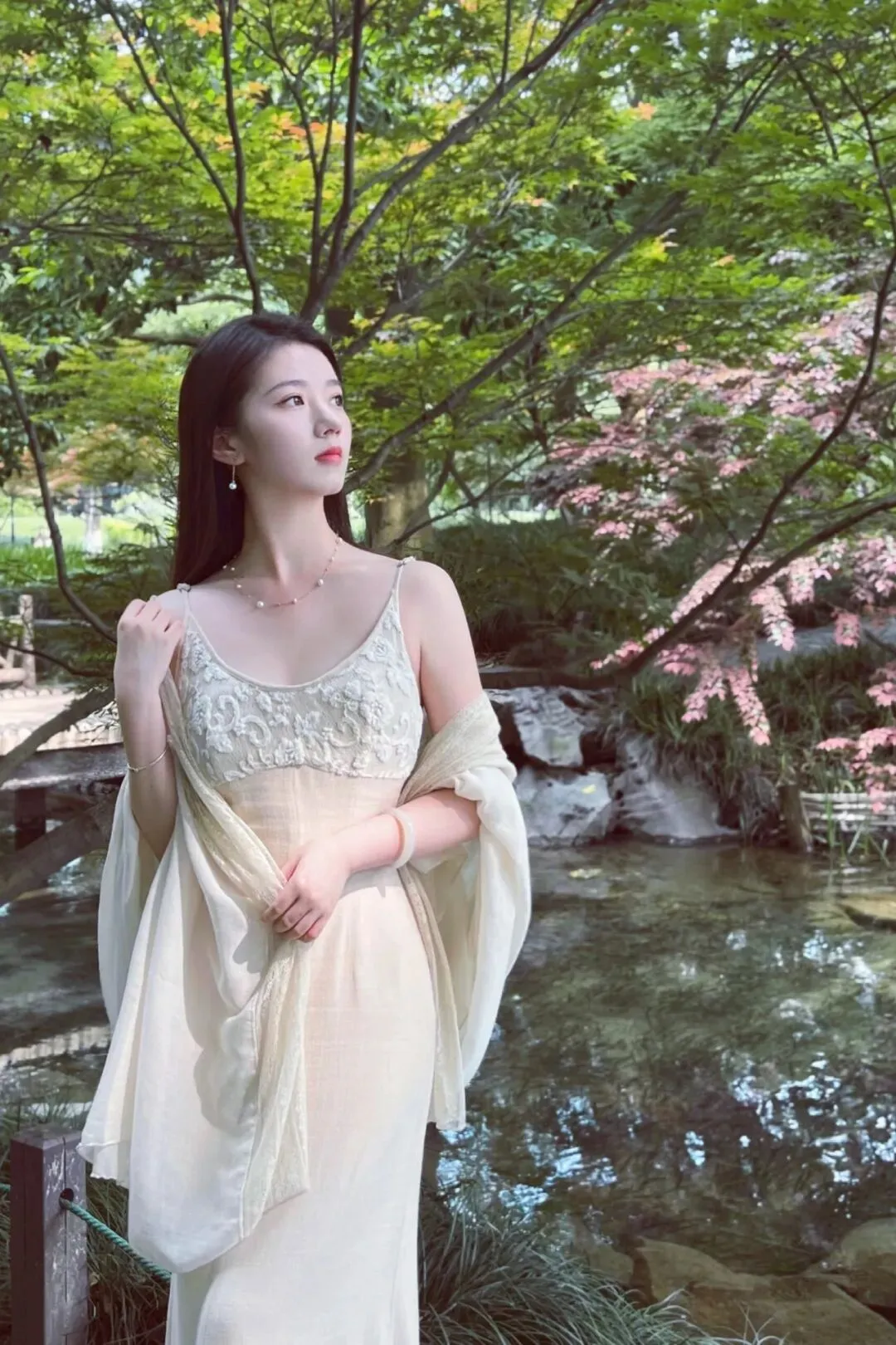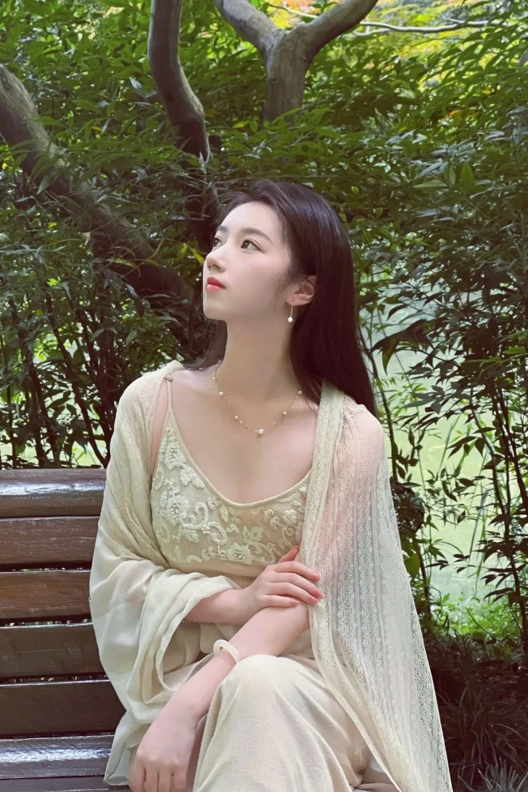 再叠加一件同色系的轻薄蕾丝披肩,那种若隐若现的垂坠感,真的太拿捏松弛感了!姐妹们,这种穿搭思路一定要锁死!它不仅能巧妙遮住拜拜肉,还能增加整体造型的层次感。再配上点睛之笔的珍珠项链和耳环,就像是散落人间的满天星,整个人都在发光,这种不费力的高级美,真的杀疯了!