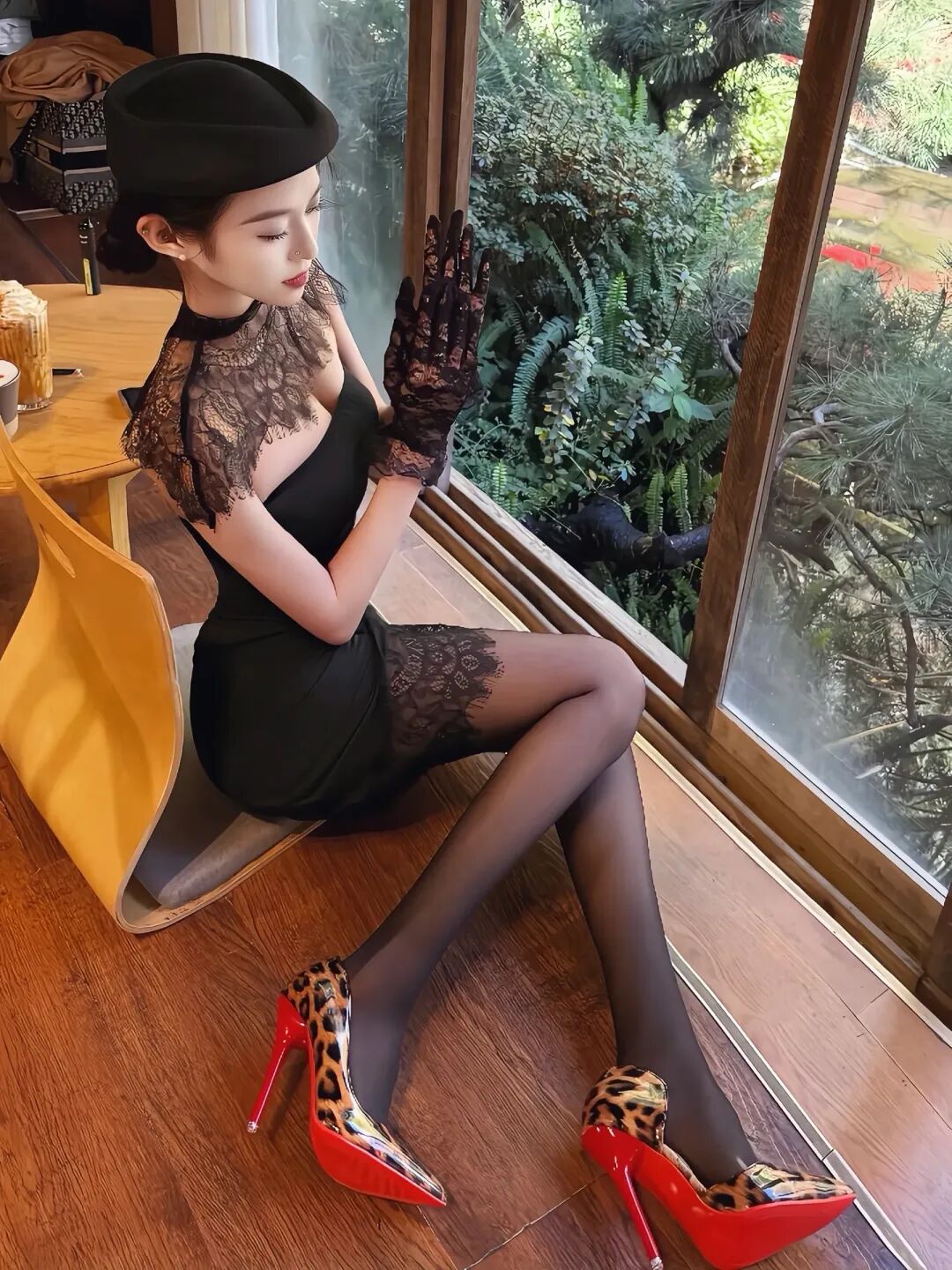 黑色缎面抹胸裙是整套造型的核心,顺滑的面料贴肤却不紧绷,恰到好处地勾勒出肩颈与腰臀的线条。裙身没有多余装饰,只在裙摆边缘缀了一圈蕾丝褶皱,走动时会随着步伐轻轻晃动,像流动的墨纹。外搭的黑色蕾丝肩领是点睛之笔,立体的花纹在光线下泛着细碎光泽,高领设计刚好卡在颈后,露出纤细的锁骨,不会显沉闷;肩袖的蕾丝延伸到上臂,遮住小臂的同时,也让整体线条更柔和。这种 “硬挺与柔软” 的搭配,没有多余的装饰,全靠材质对比撑起复古氛围。她的搭配思路做了减法,只戴了一顶黑色贝雷帽,帽檐压得略低,刚好遮住半张脸,为整个冷艳的造型添了一抹神秘感。黑色蕾丝手套是造型的灵魂,长及手腕的设计和肩领的蕾丝完美呼应,举手投足间都带着克制的优雅。旁边散落的豹纹红底高跟鞋是暗藏的小心机,野性的花纹和红底的艳丽打破了全黑的沉闷,让整个造型多了一点张扬的性感。