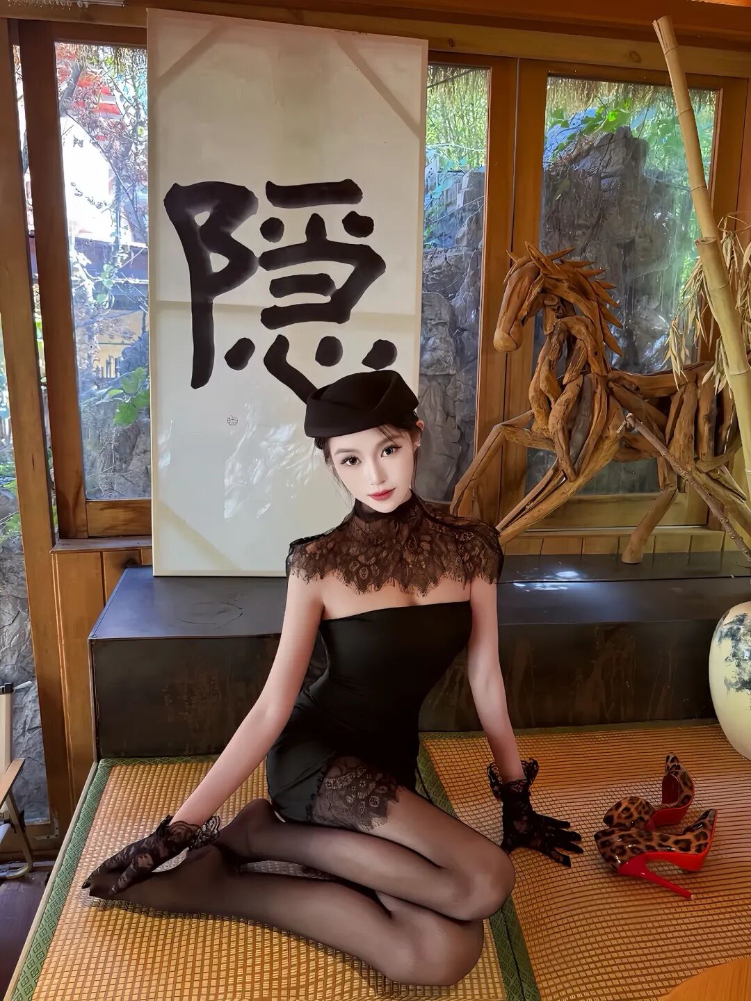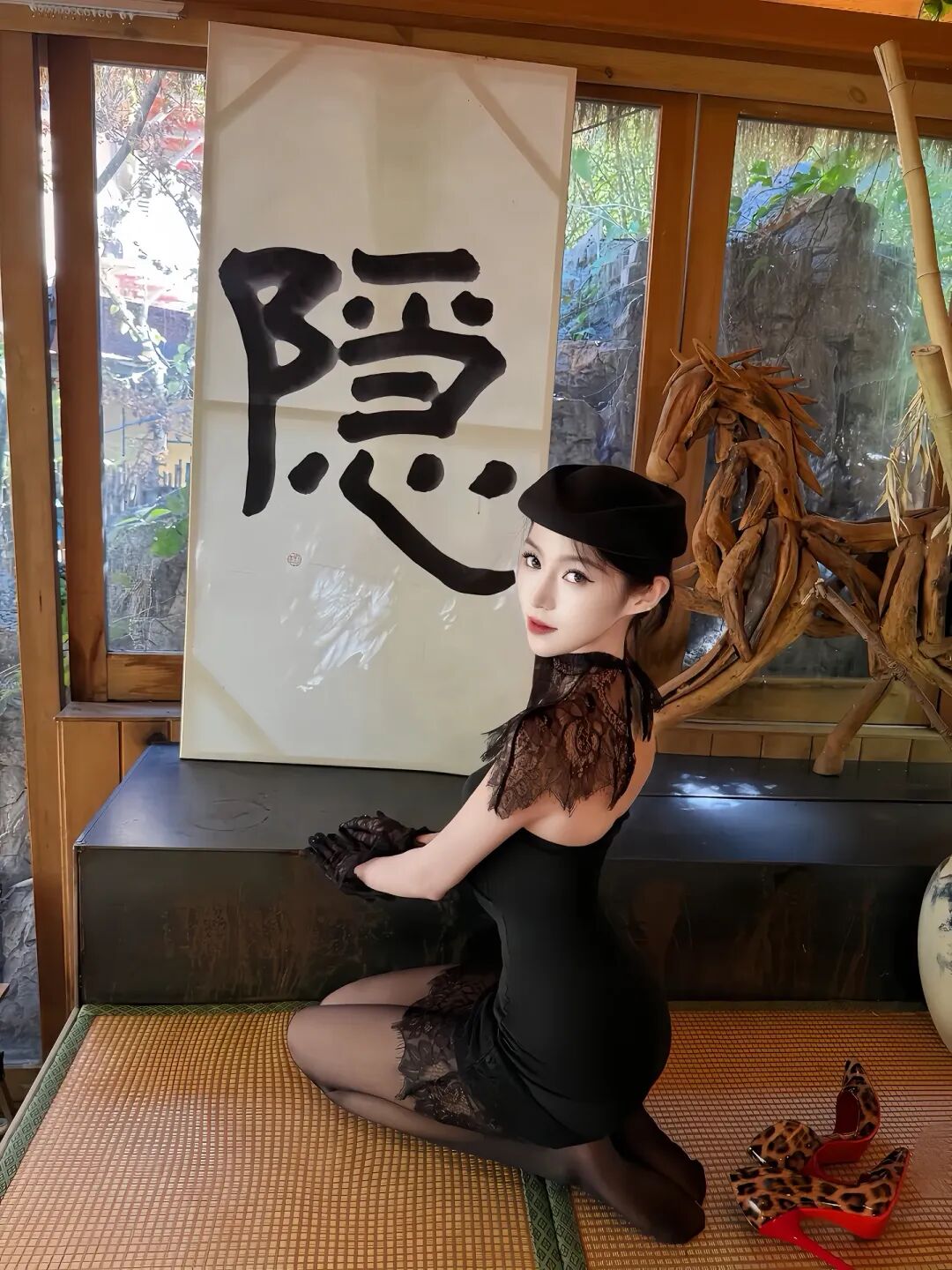 跪坐在竹席上时,她微微转头,长发垂在肩前,缎面的顺滑和蕾丝的细腻在光影里若隐若现。身后的 “隐” 字书法在白墙背景下格外醒目,她的身影在画面里既融入环境,又自带焦点,像从老电影里走出来的冷艳特工,带着点疏离的魅惑。坐在木质地板上时,她挺直脊背,贝雷帽的轮廓和蕾丝肩领的线条在动作里更显利落,手套的花纹和裙身的褶皱形成奇妙对比。她的眼神清冷却有力量,嘴角带着浅笑,仿佛周围的书法与原木家具,都成了她穿搭的一部分。这种 “不费力” 的好看,比刻意凹造型更有吸引力。这套穿搭的妙处,从来不是 “颜色多抢眼”,而是 “氛围够统一”。从缎面抹胸到蕾丝肩领,再到贝雷帽与手套,所有元素都围绕着 “冷艳复古” 这个核心,材质层次的变化让整体不单调,却又没有冲突感。