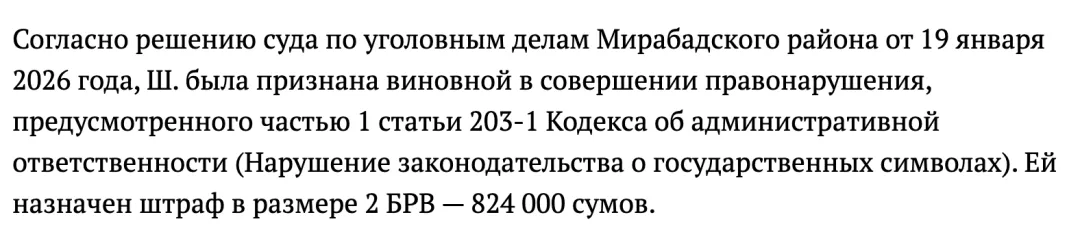 根据kun.uz的报道,2026年1月19日,米拉巴德地区法院给出了最终判决。