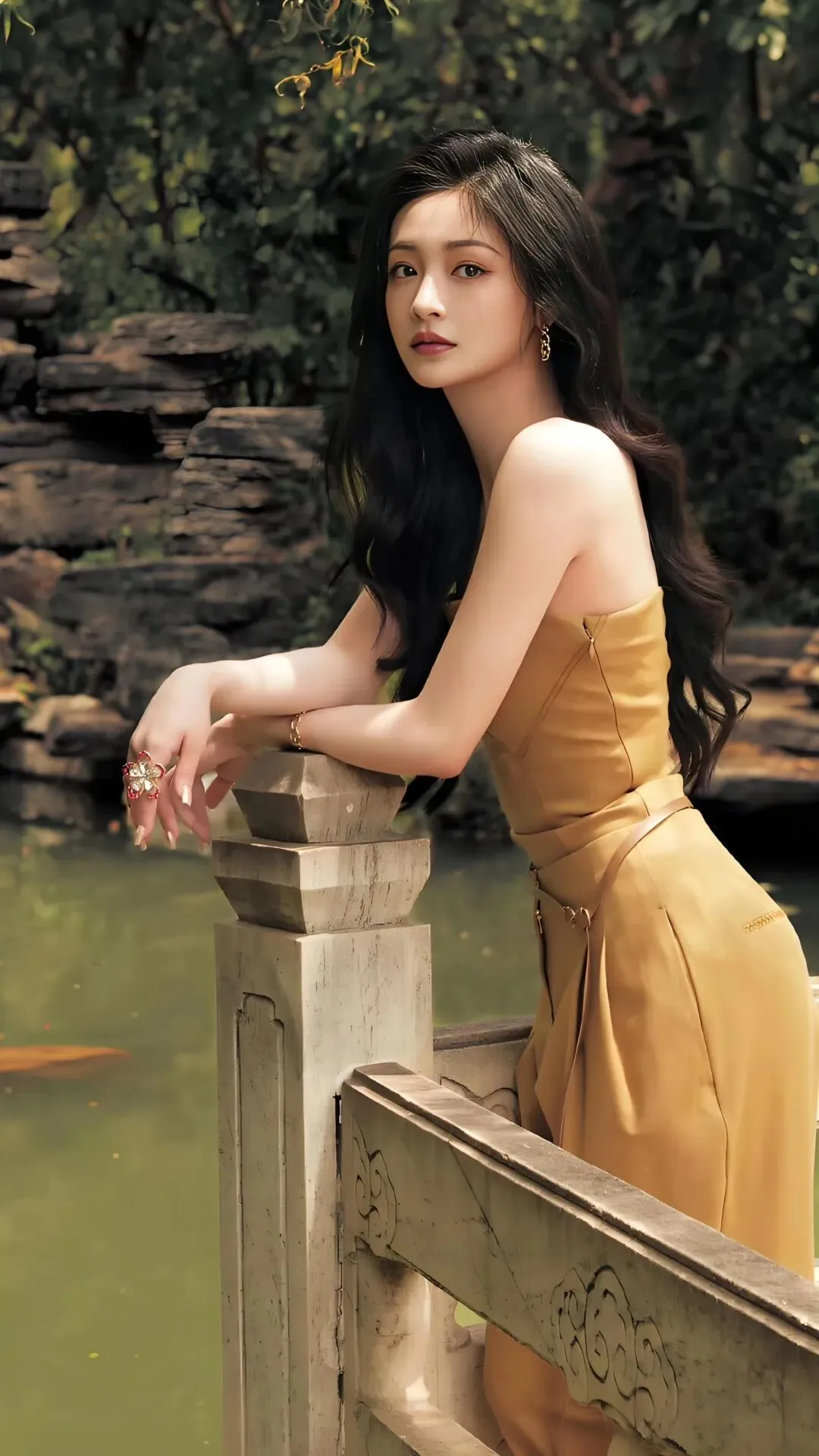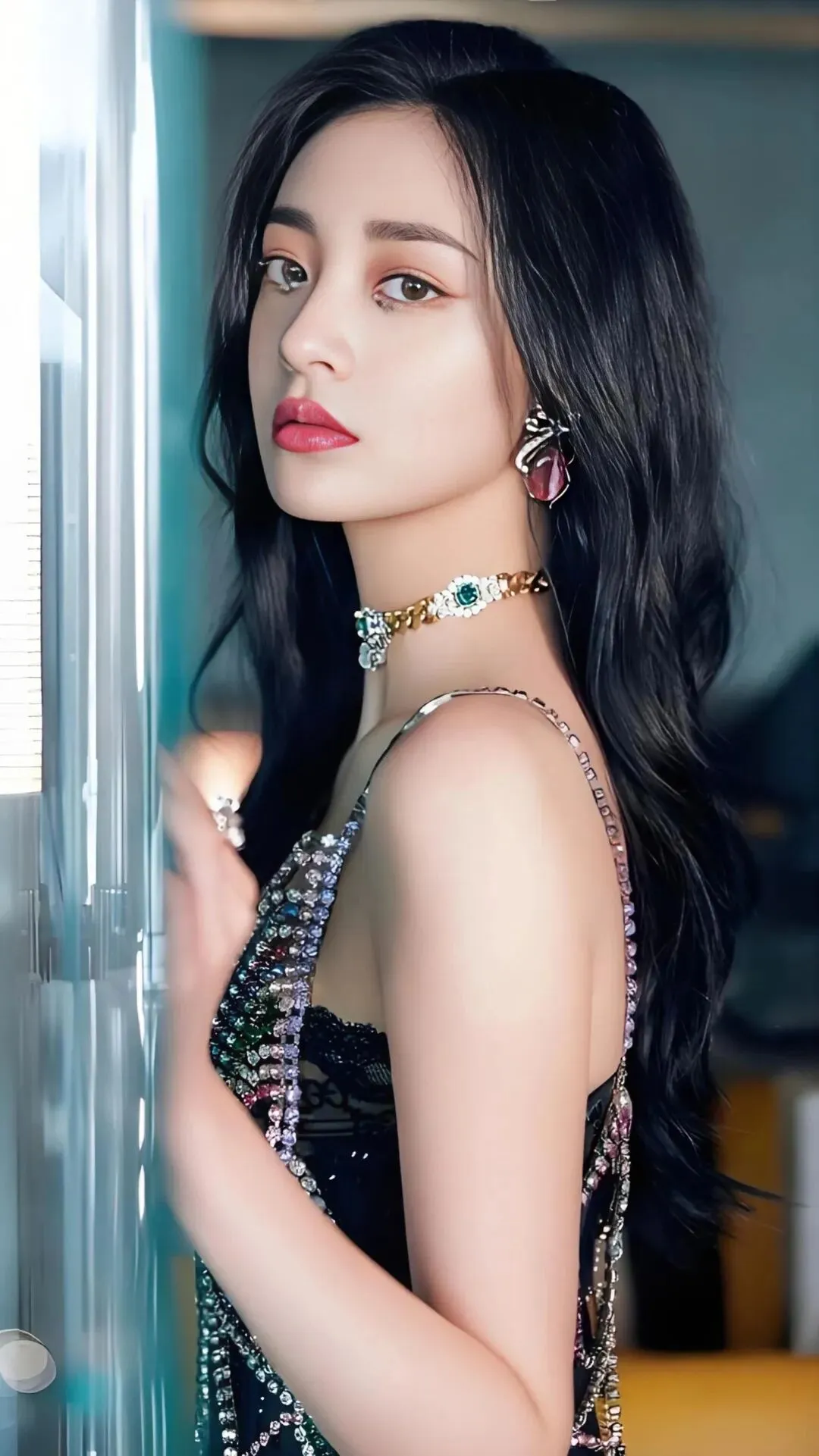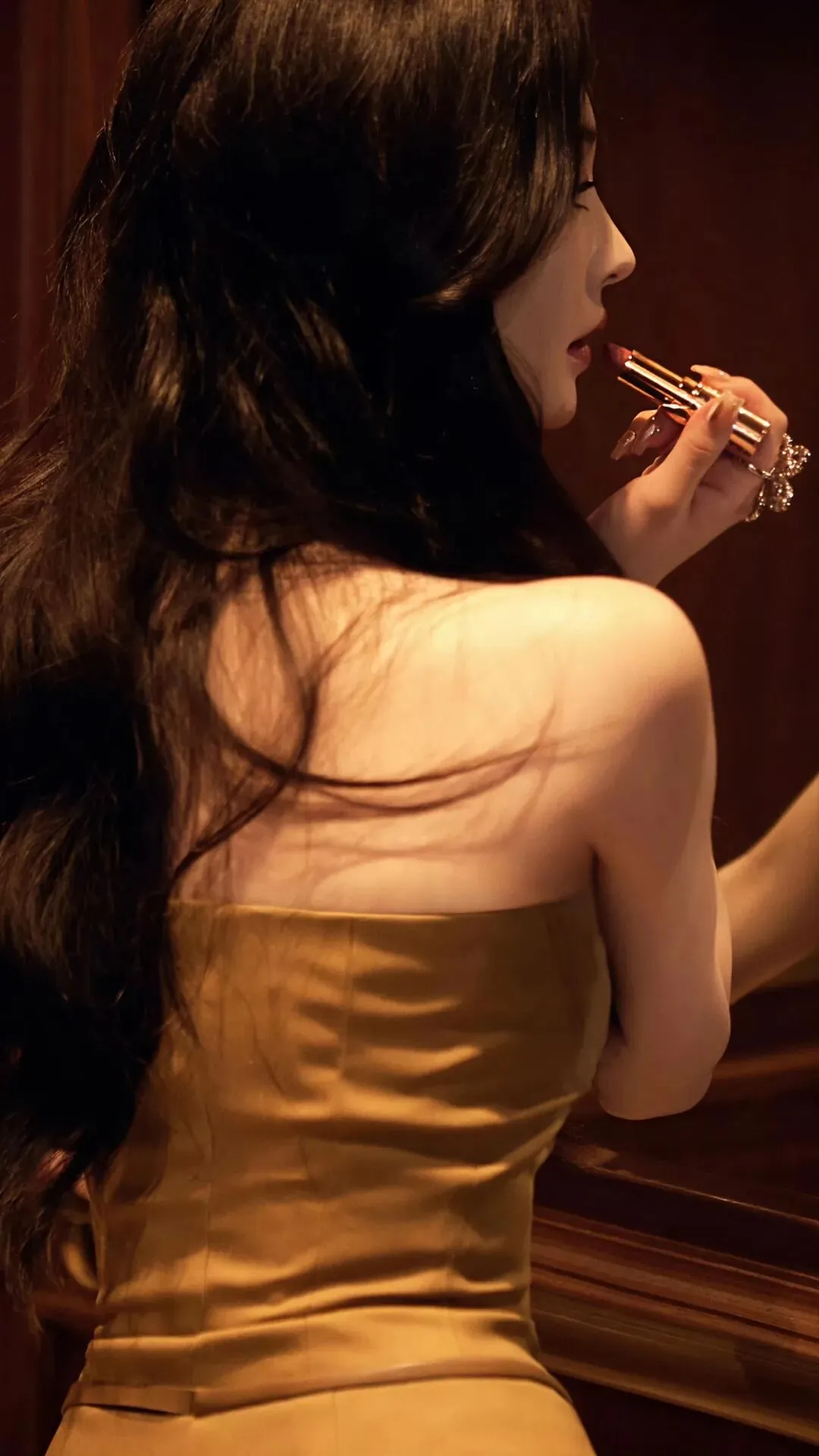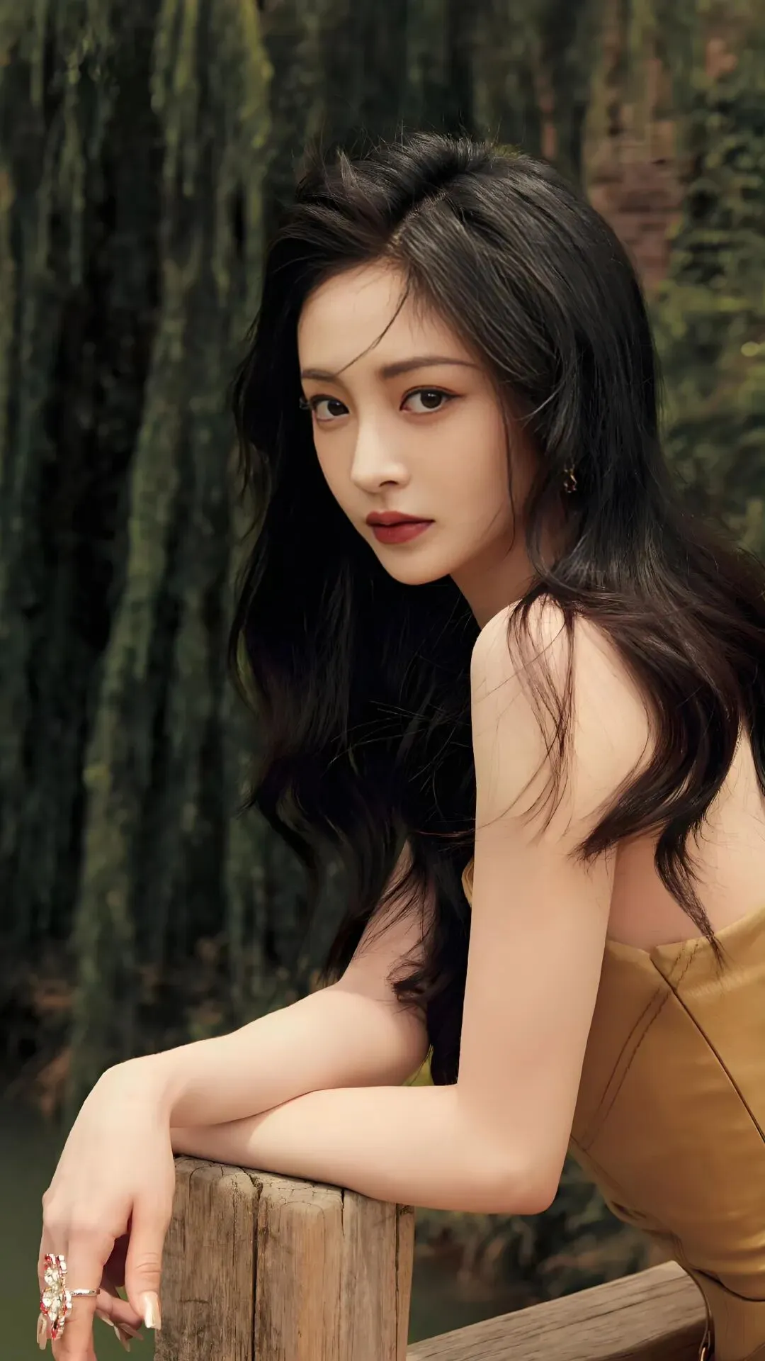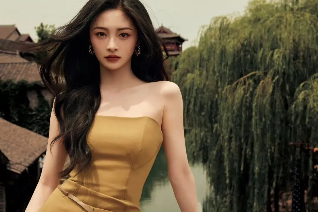 她的造型往往通过“刚柔并济”的对比来增强层次感,如金裙的细腻光泽与枝丫的粗糙纹理对比,或是古典画框的硬朗与身体线条的柔美对比,这些都让视觉语言更为丰富和耐看。