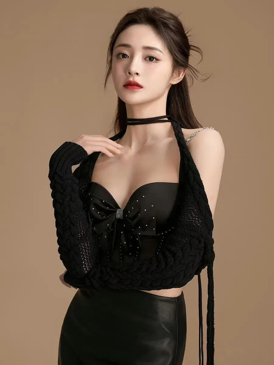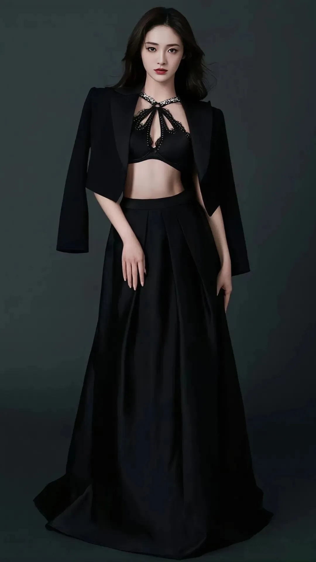 相对于浓墨重彩,她也精通于用极简营造氛围。一组黑白写真中,她仅着黑色背心,在黑白影调下,流畅的侧颜线条与清晰的锁骨成为焦点,深邃眼眸中蕴含的故事感,让画面充满了沉静而高级的张力。